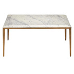 The Oblique Cocktail Table is an elegant statement piece that showcases stunning white lilac marble. Its tapered legs and frame are finished in an antique brass and support the chamfered marble slab. The stone is slightly elevated above the metal frame, creating a striking floating effect.