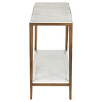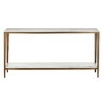 The Oblique Console Table is an elegant statement piece that showcases stunning white lilac marble. Its tapered legs and frame are finished in an antique brass and support the chamfered marble slab. The stone is slightly elevated above the metal frame, creating a striking floating effect.
