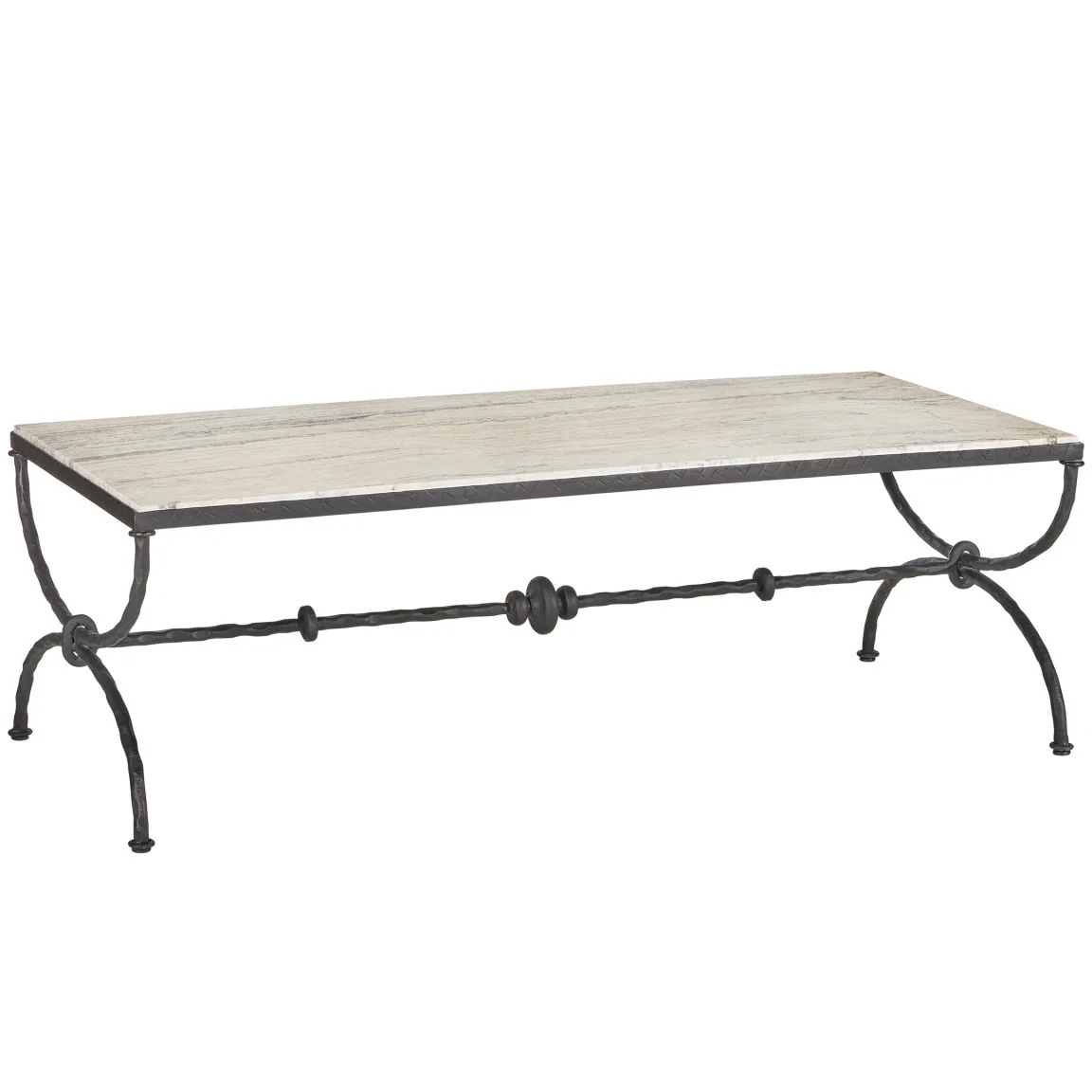 Drawing inspiration from classical Greek design, the Agora Cocktail Table showcases white travertine with dynamic veining. The gently curving legs give the table a sculptural feel, while a center stretcher with decorative orb detailing adds extra visual interest. Finished in a rich bronze, the metal frame perfectly complements the light hue of the travertine, which will vary from piece to piece.