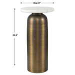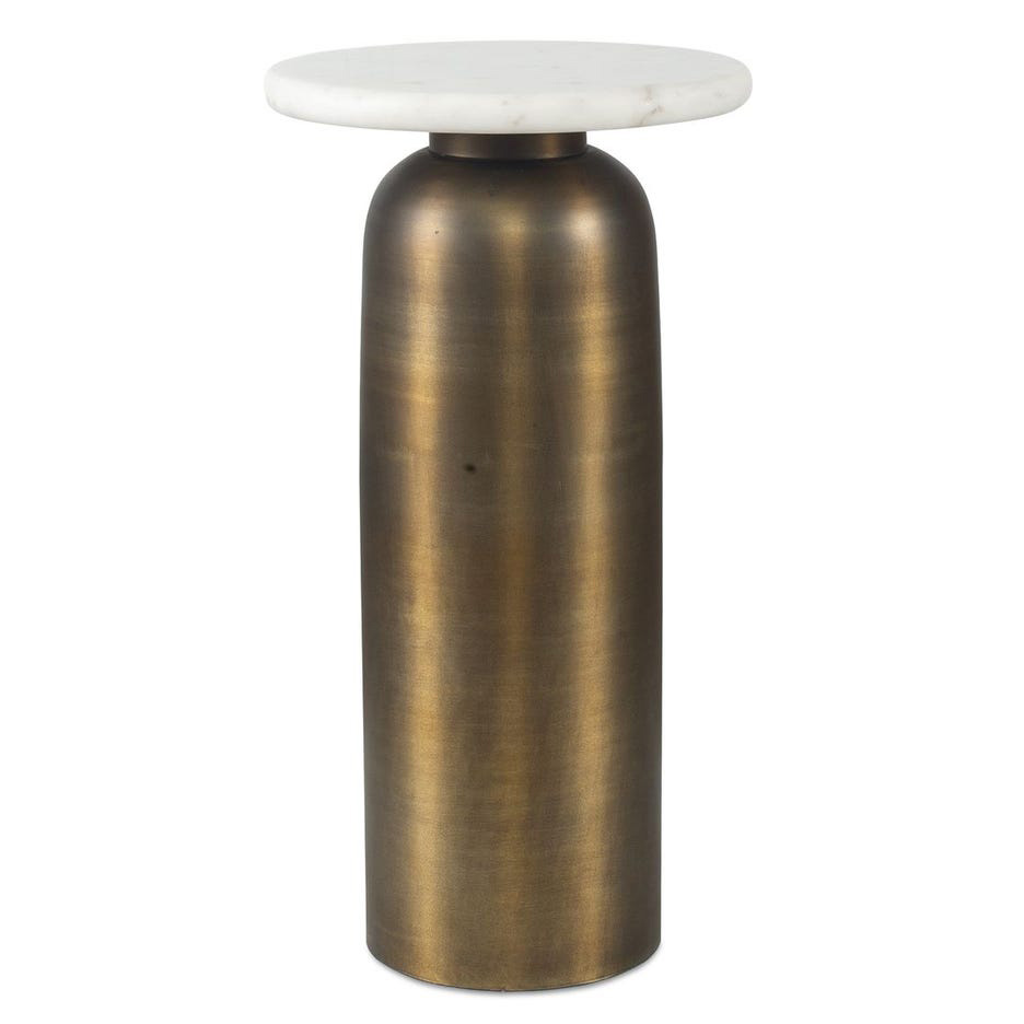 The Reiss Drink Table presents a sleek interplay of materials. A striking antique aluminum base provides a warm contrast to the cool luxury of a white marble top. True to the character of natural materials, each tabletop will have unique veining.