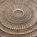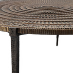 Inspired by metalwork artifacts from the Bronze Age, the Unity Cocktail Table features a raised concentric pattern, finished in antique brass. A dark bronze finish on the frame creates subtle contrast, gathering into zig-zagging indentations for a tactile effect. Due to the artisanal material, the surface may vary slightly from table to table.