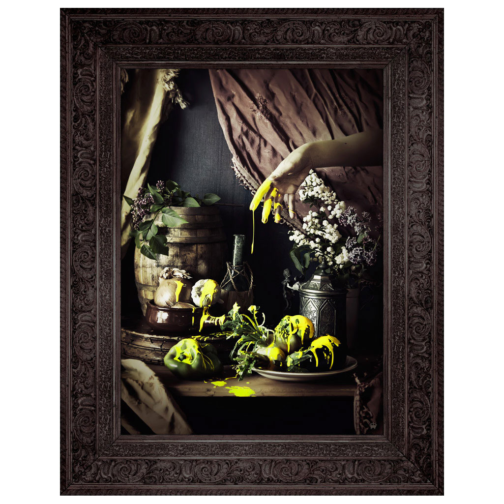 Drawing inspiration from the works of master painters, 'Strange Fruit' offers an intriguing mixture of the past and present featuring a still life portrait that depicts a table bearing fruit with fluorescent yellow paint dripped over. Complete with integrated Black printed ornate frame.