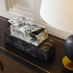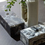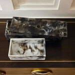 The Kayce Box Set is inspired by classic nesting boxes, this pair of containers deliver a marble-like effect. This stylish set plays with the contrast of black and white swirled resin, and each will have its own distinct pattern. A small round opening in each lid allows for easy lifting. Finish will vary.