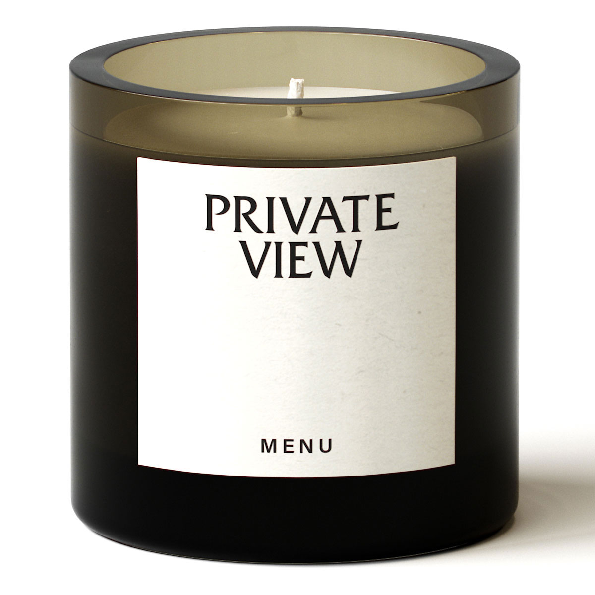 - Private View: A romantic scent intended for intimate quarters. Top notes: eucalyptus, mandarin zest. Middle notes: patchouli, vetiver, cypress. Base notes: leather, palo santo, vanilla, cedarwood.