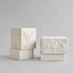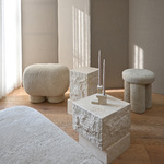 Rich on architectural references, Temple Coffee Tables reminisces architectural facades to create a play of tactile and polished surfaces. Made from a beautiful sand color limestone, each table consists of two staggered blocks on top of each other. Rich on texture, small holes and incorrections, each table embraces the beauty of the natural stone. Made by skilled stone artisans, the tactile surface is achieved by delicate hand carvings. Temple Coffee Tables comes in two sizes and is suitable for many purposes, such as coffee tables, side table and plinths to exhibit objects. Limestone is suitable for outdoor use.