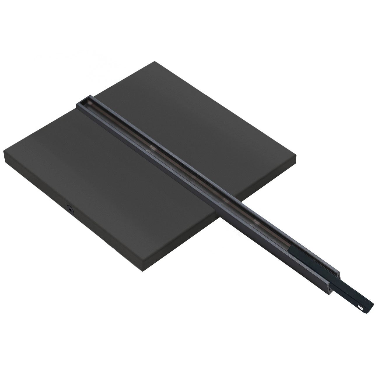 The MicroTrack Ceiling End Power Feed with 4.5 inch square or 1 inch rectangular canopy and 10 inch track section and connector powers the track with a 48VDC Class 2 remote power supply up to 96 watts (power supply not included).