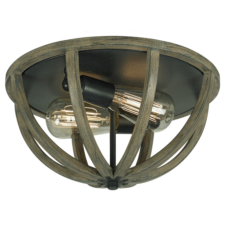 The Allier Flush Mount features a Weathered Oak Wood frame with an Antique Forged Iron finish. Two 60 watt max 120 volt medium base bulbs are required, but not included. Ideally suited for vintage-style squirrel cage bulbs. 13 inch width x 7 inch height. UL listed. Suitable for damp locations.