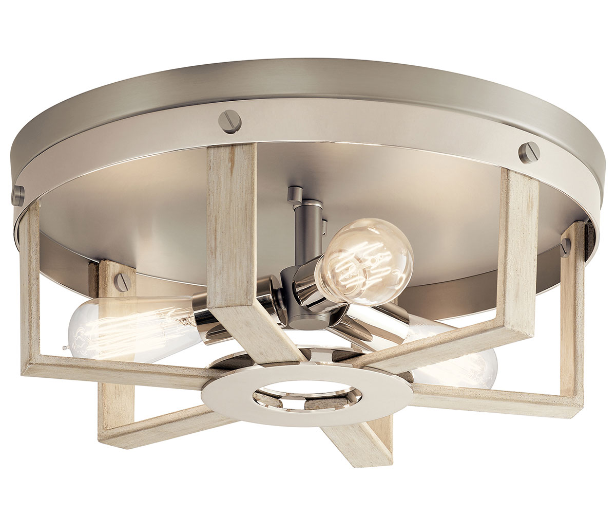 The popular industrial-inspired cage look gets a refreshing update with the Peyton Flush Mount Ceiling Light. Squared edges and lines, in a blend of Whitewashed Wood-tones as well as Polished and Satin Nickel metals, create a style that's soft and modern. Shown with vintage style bulb. UL listed for damp locations.