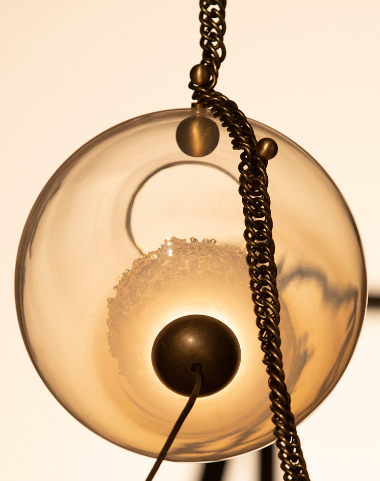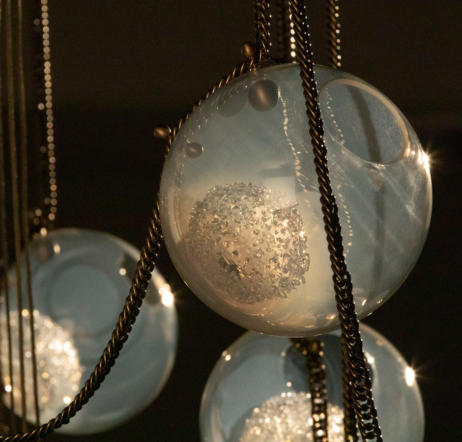Each globe is hand blown by a Montreal glass artist. A smaller scaled glass globe lies inside, inspired by the texture of sea urchins. Two brass pearls appear to float in each globe, which is suspended by aged brass chains and hand-textured metal cylinders. The effect is simply breathtaking.