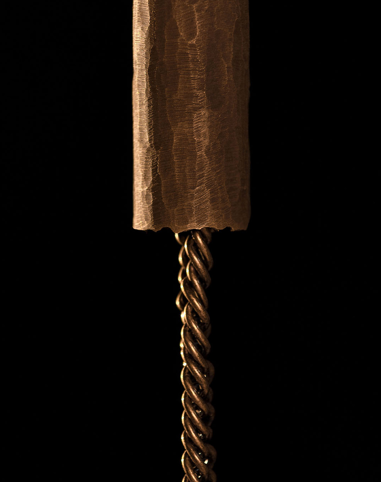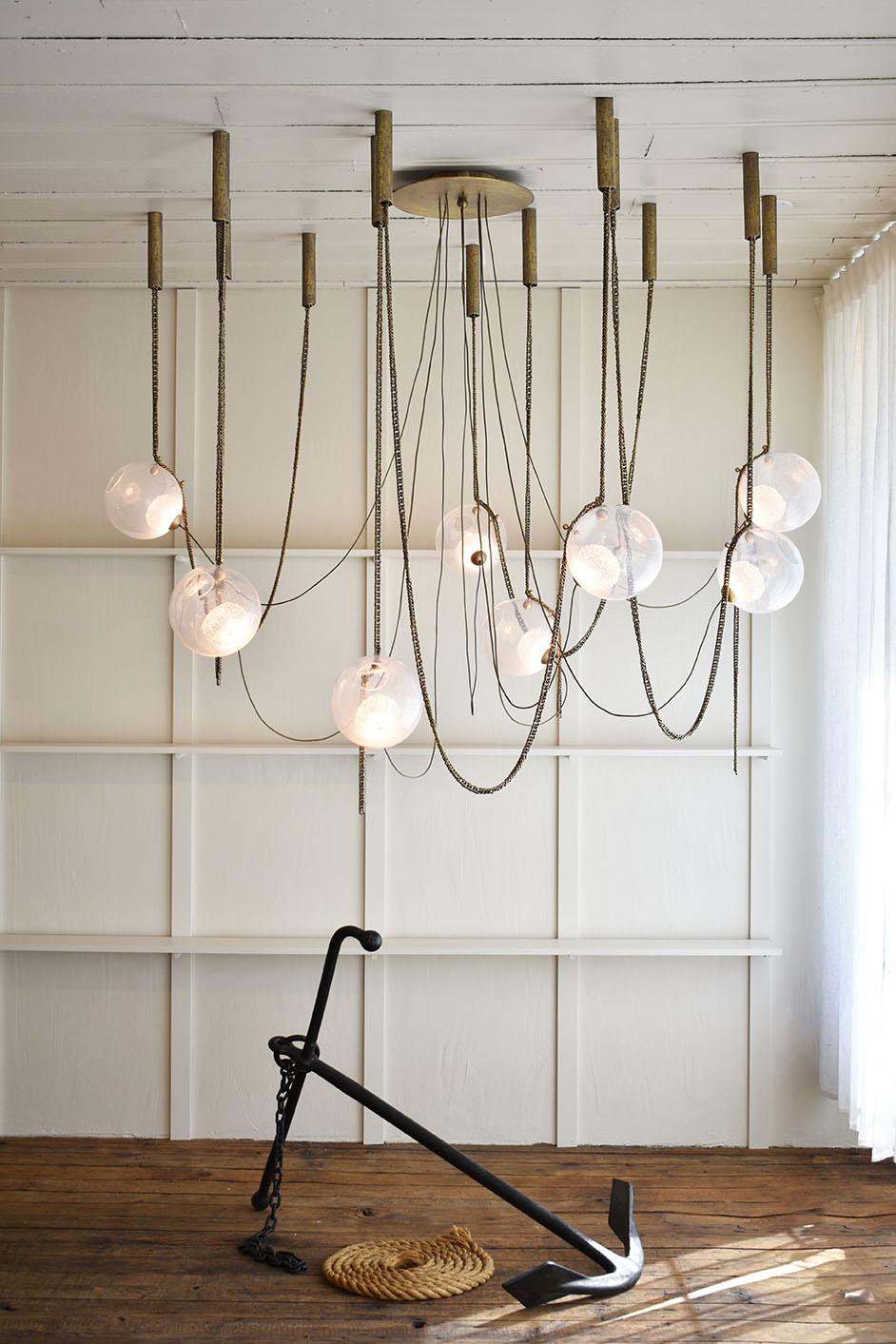 Bold brass chains and pearls sport an aged patina that looks as if they were submerged in seawater for ages. These enhance the warm light, giving it an elemental feel.