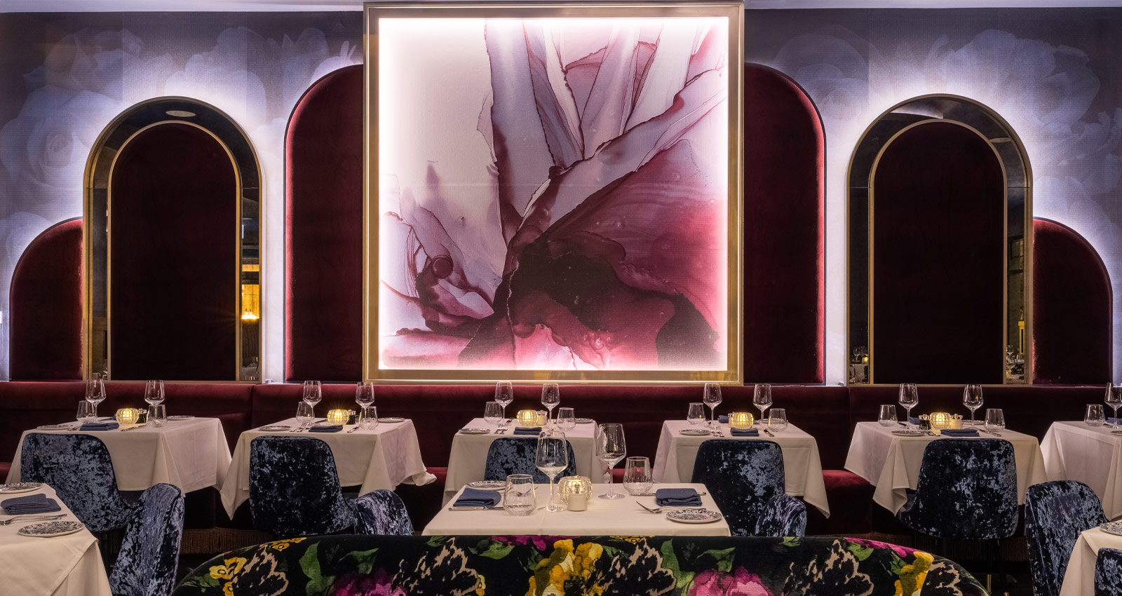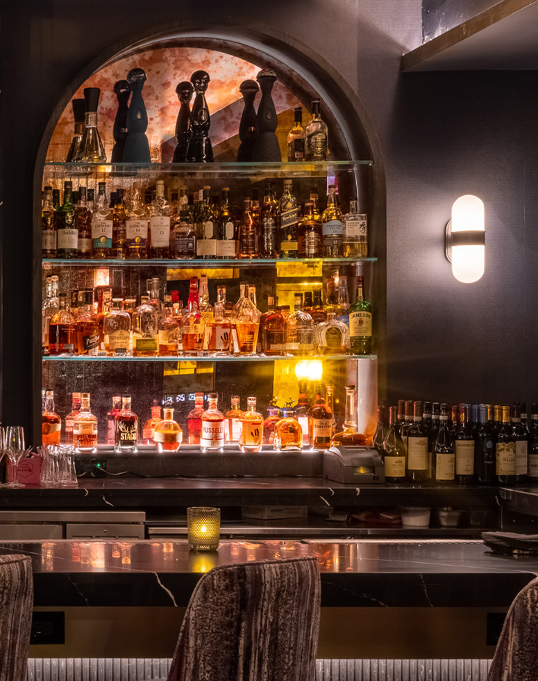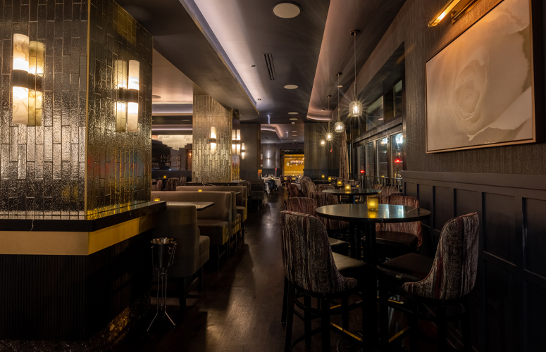 Full of swoonworthy, eye-catching elements, Adalina sweeps guests to a world away from the bustling city just outside. The opulent, luxurious lighting completely transforms this space, bathing everyone and everything in a soft glow. It enhances the plush textures and rich hues found everywhere you look, from the ornate furnishings to the gorgeous florals and vintage-inspired patterns on the wall and ceiling coverings.