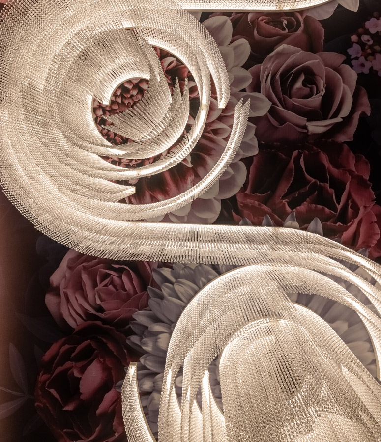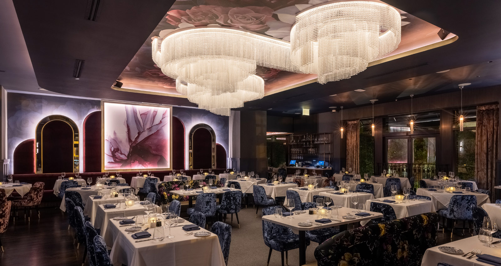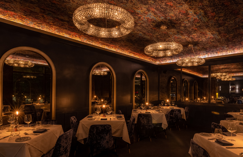 Perhaps the most stunning moment of all at Adalina is the ethereal chandelier that floats above the main dining room. Produced by Italian lighting manufacturer Masiero, this ornate custom piece flows with the organic, fluid look of the rose wallpaper that covers the ceiling. Expertly paired with smaller pendants and wall sconces, backlighting and wall grazers, this showstopper brings the exuberance of the Roaring Twenties to this highly sophisticated and still modern space.