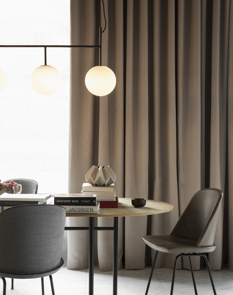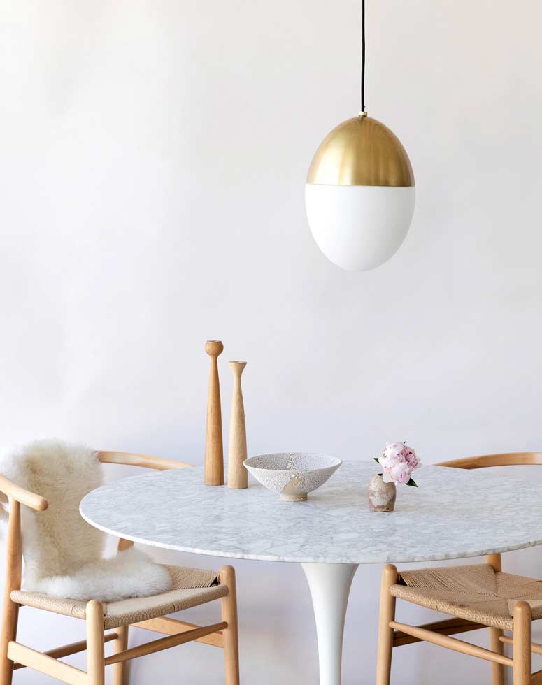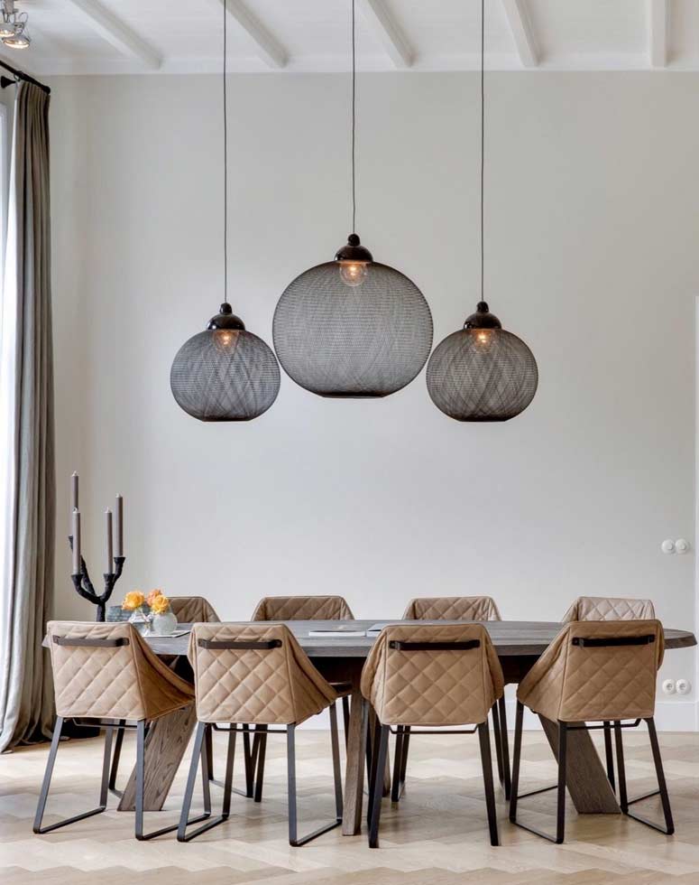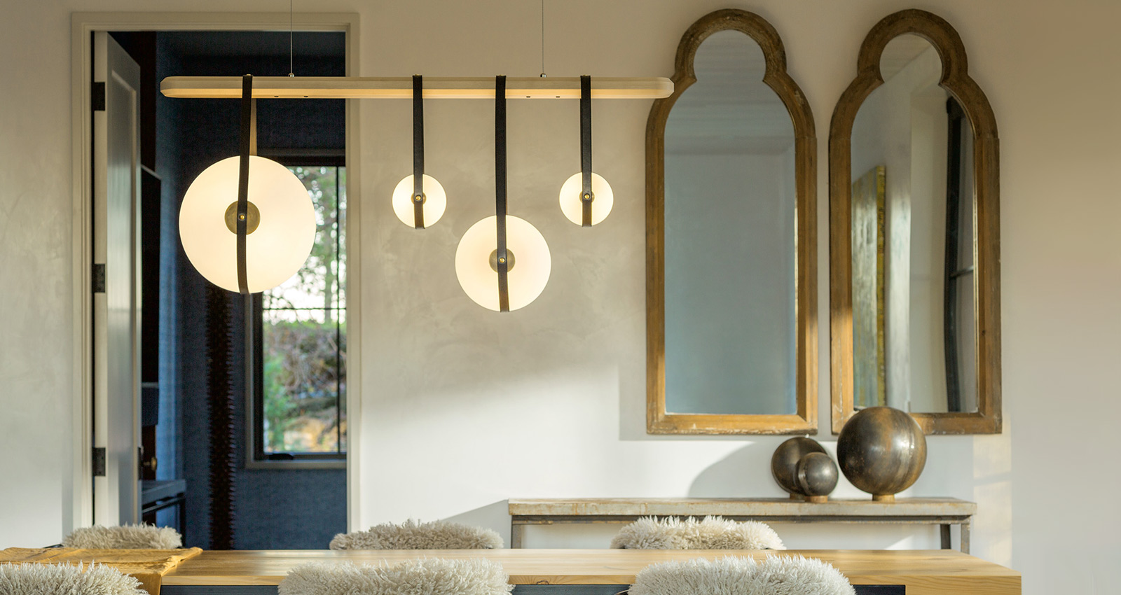 When it comes to dining room chandeliers and pendants, mimic the shape of your table. Linear suspensions should run the same direction as a rectangular or oval dining table, but make sure the size is right. You want a minimum of six inches of breathing room between the edge of your fixture, and the edge of your dining table. For round tables, consider round or sputnik pendants. If your table is large enough, a cluster of two or three pendants should do the trick.