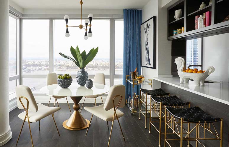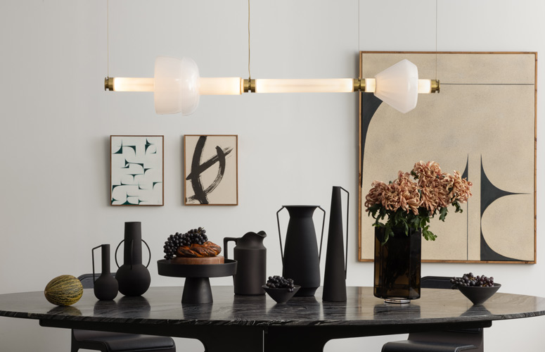 Like any great dinner party, the best dining rooms spark conversation. Jewelry-inspired chandeliers & pendants, a textural table, sculptural seating and abstract artwork leave a lasting impression on guests. Go big and go bold.