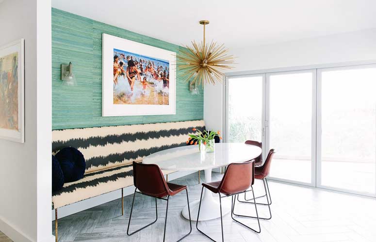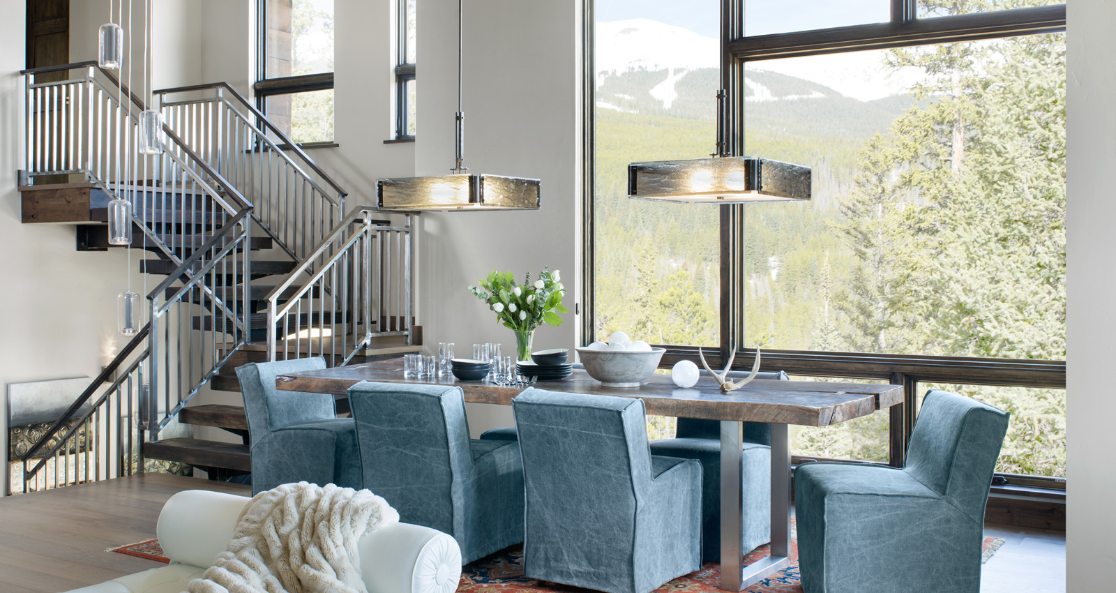 From open concepts to breakfast nooks, the dining rooms of today are designed to blend into border-less kitchens and living rooms with ease. That said, there are still ways to give it personality and maintain the flow. A rustic wooden farmhouse table pops next to an all white kitchen, without creating dissonance. Chandeliers and pendants are an opportunity to pull textures and tones found in nearby countertops and artwork, tying adjacent rooms together while creating a unique dining environment.