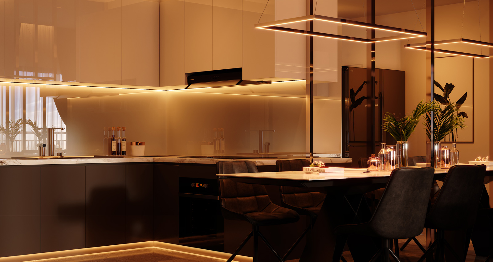 Much like a powder room, the dining room is a great place to play with color. Patterned tablecloths, vibrant upholstery and saturated wall coverings can help brighten the space. Of course, don't forget about the lighting. Not only can you bring color in with a light fixtures materials, but the color temperature of your fixtures is crucial, it's the real secret ingredient. Dimming is a must in any dining room, and technologies like Warm Dim and Tunable White take it one step further. With Warm Dim, you can dial from a bright 3000K or 2700K down to 1800K reminiscent of candlelight - the perfect setting for any romantic dinner. Tunable White gives you even more control, allowing you to dial up to a crisp 4000K or hone in on a blazing 2000K - a color reminiscent of the coveted Golden Hour.