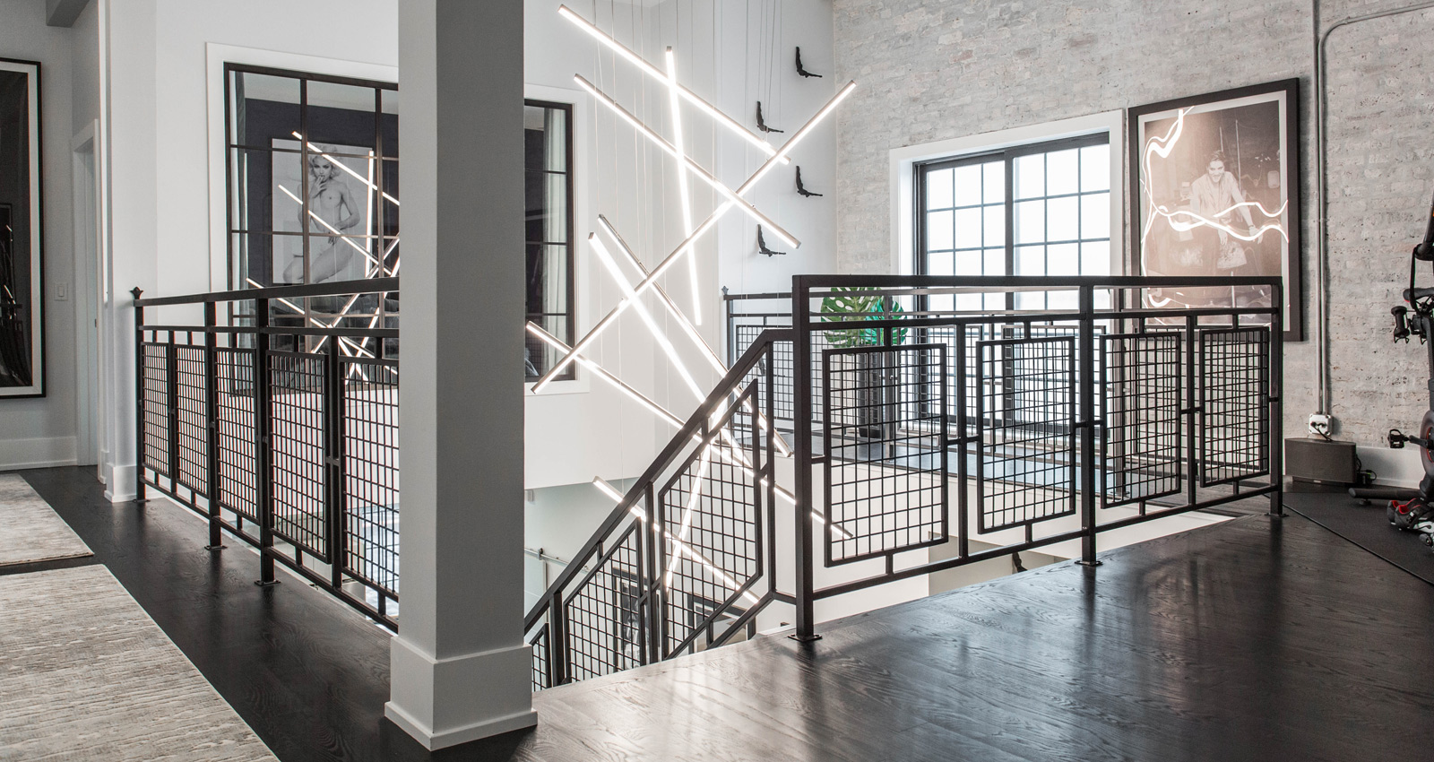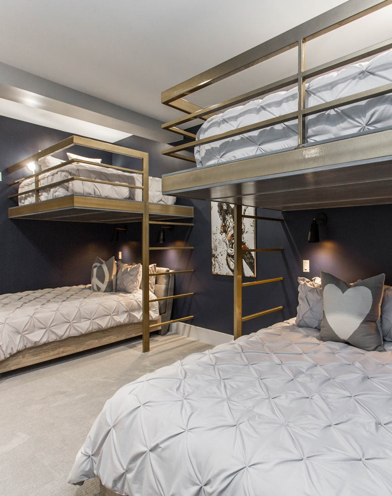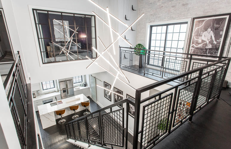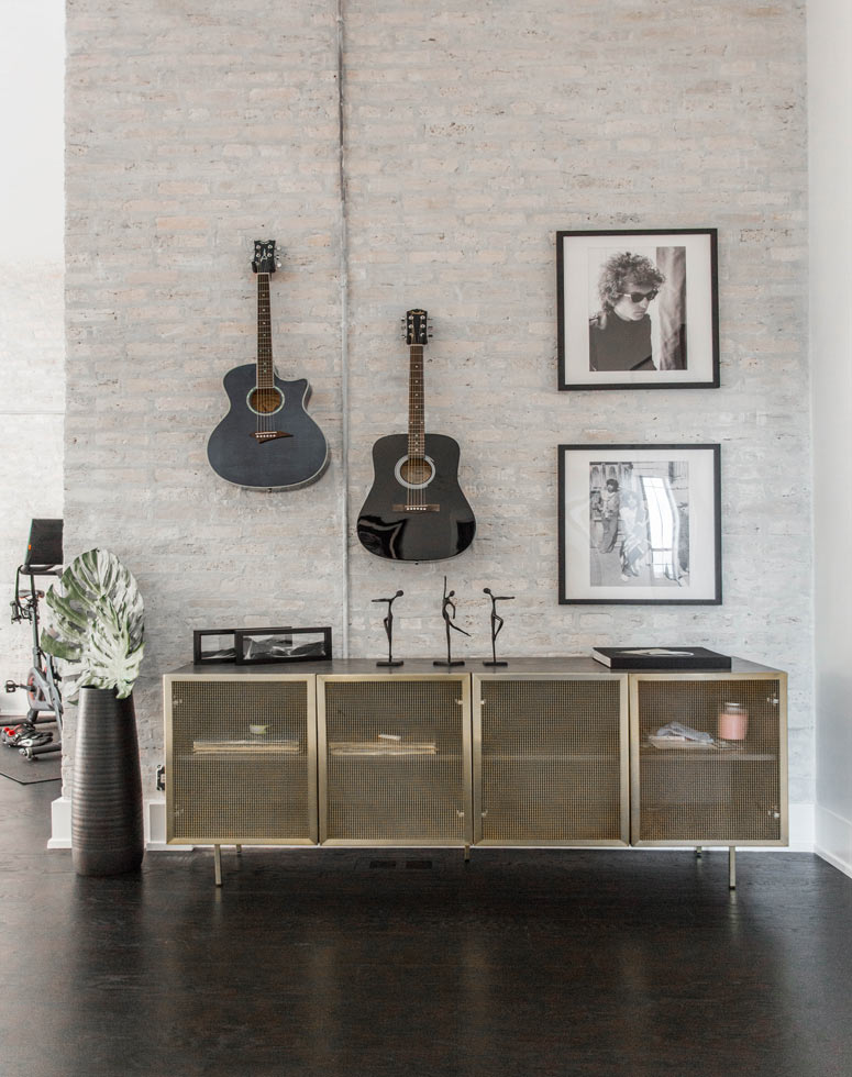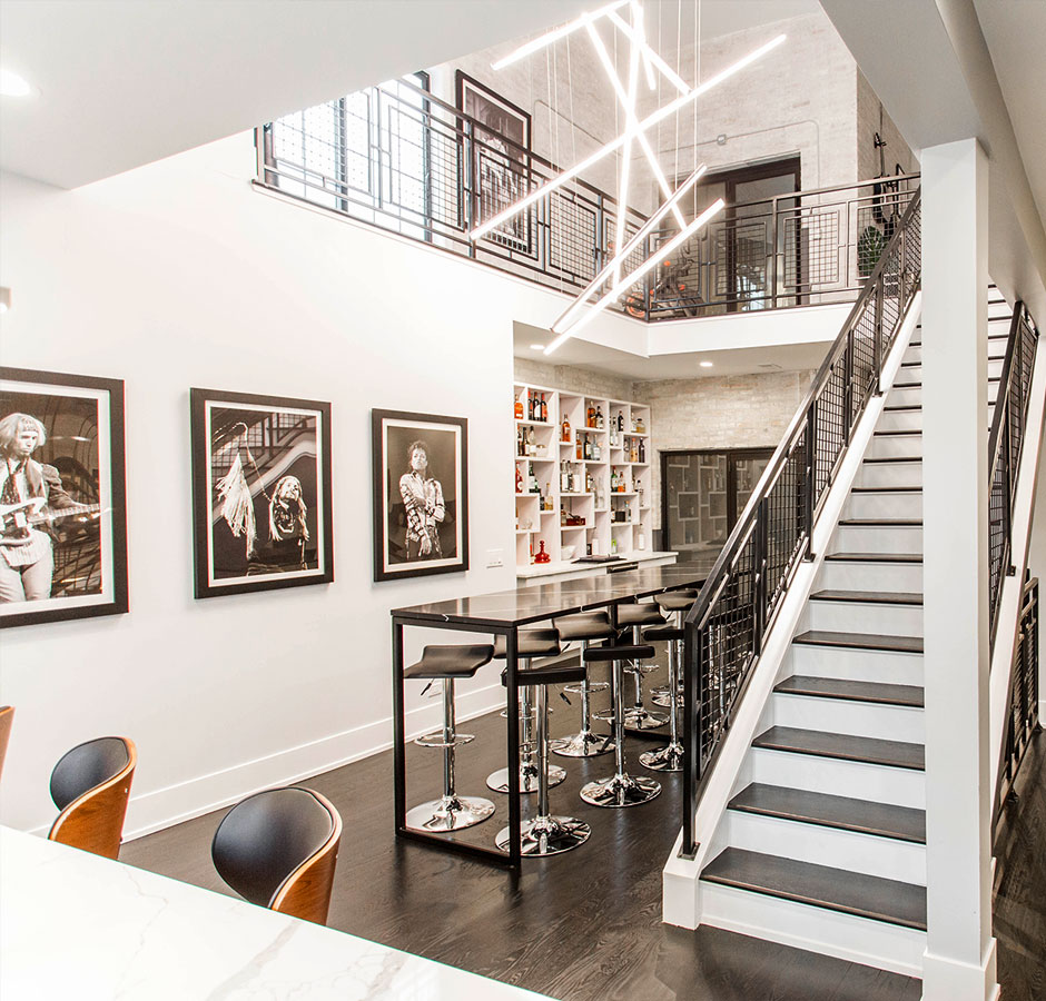 Kelly employed the use of a vertical corridor rather than enclosing the space with extra walls and obscured stairwells. The second floor offers three themed bedrooms, a Peloton workout area, and two full bathrooms. The modern industrial vibe of the main floor spills upwards into the second floor while beautifully integrating modern decor and pieces of art that continue Kelly's rockstar motif.