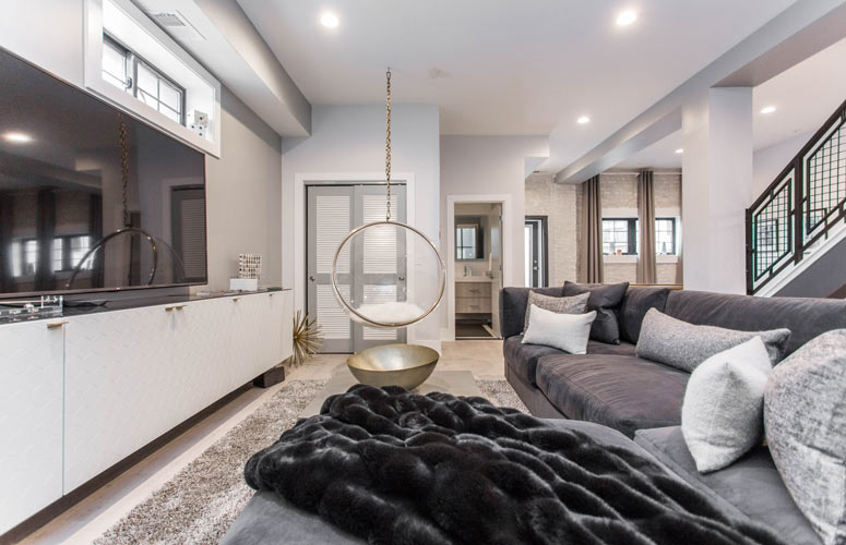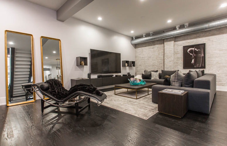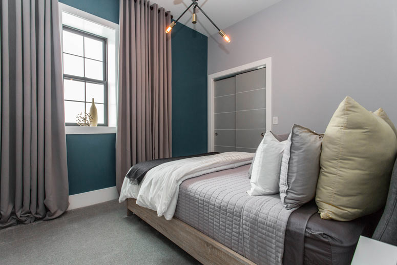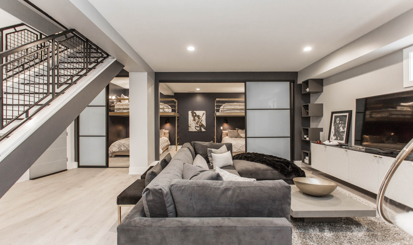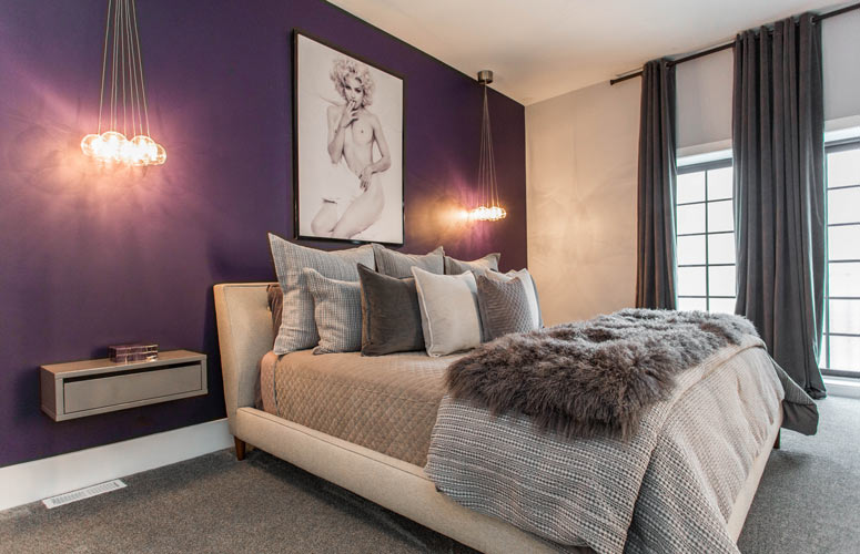 Kelly employed the use of a vertical corridor rather than enclosing the space with extra walls and obscured stairwells. The second floor offers three themed bedrooms, a Peloton workout area, and two full bathrooms. The modern industrial vibe of the main floor spills upwards into the second floor while beautifully integrating modern decor and pieces of art that continue Kelly's rockstar motif.