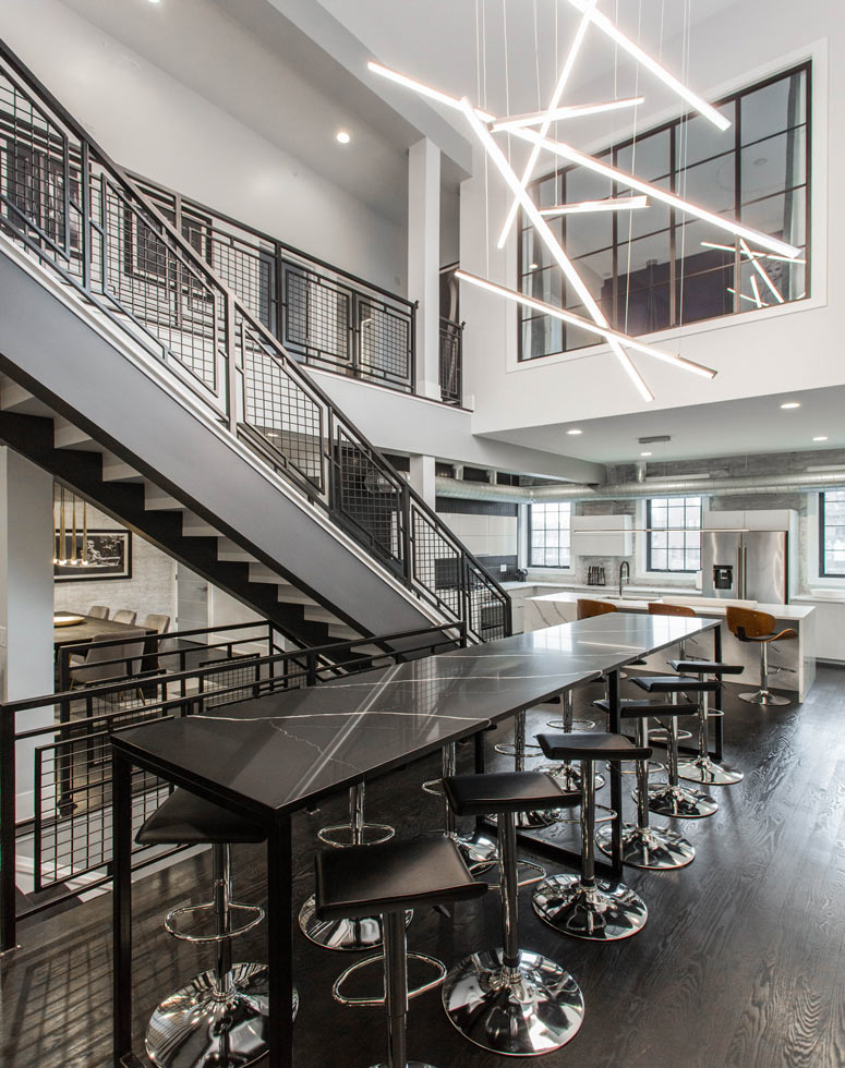 Opening the transition between the main and second floors allowed the design of the home to truly highlight the spacious foyer. The use of the cascading Cirrus from PureEdge Lighting downward from the second floor provides a focal point for the entryway and mirrors the ultra modern, minimalist design scheme that permeates throughout. Notice how the light fixture's arrangement seems to parallel the stone pattern of the elongated high top yet provides stylish contrast to the hard lines and stark colors of the interior.