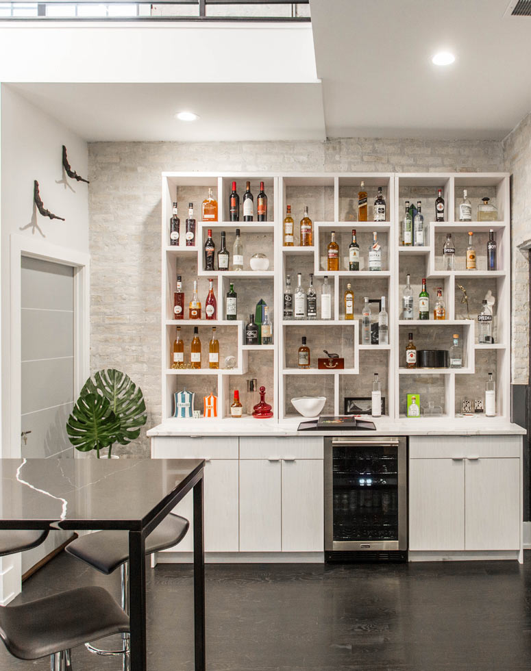 The kitchen gives way to the dining and living room area, well equipped to entertain and inspire. The fully stocked bar near the hightop gives the white and black space a touch of color and satisfying organization. Exposed brick and duct work remind entrants of the industrial and vintage roots of the condo's firehouse origin.