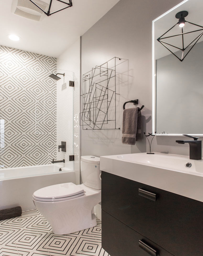 Accents of deep blues and greens give the two guest bedrooms a homey aura, yet adhering to the overall rockstar theme. The pleasing geometry of the upstairs half bath is another example of creative differentiation that ultimately draws back to the predominant motif.