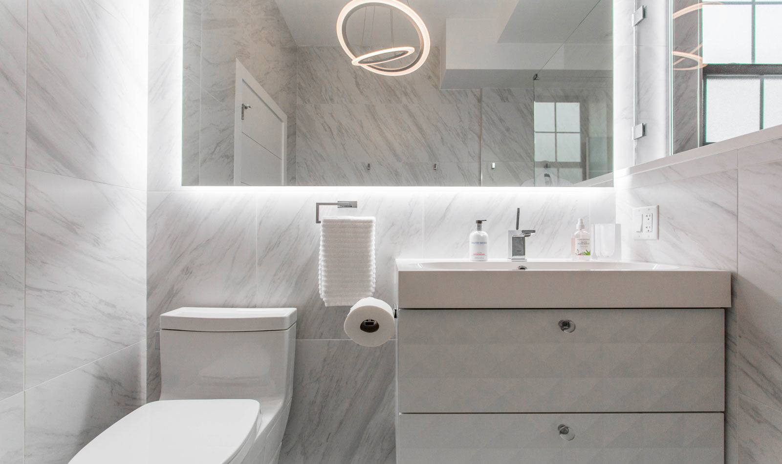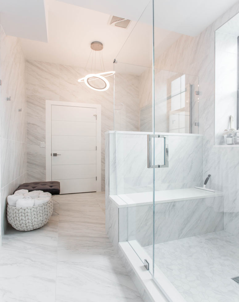 The master suite yet again shows off Laura's amazing eye for detail. The bathroom is a masterpiece, strategically blending elegant light fixtures with incredible marble tile. The gritty rockstar vibe elsewhere slowly evolves to the glamorous white oasis that is the master bath.