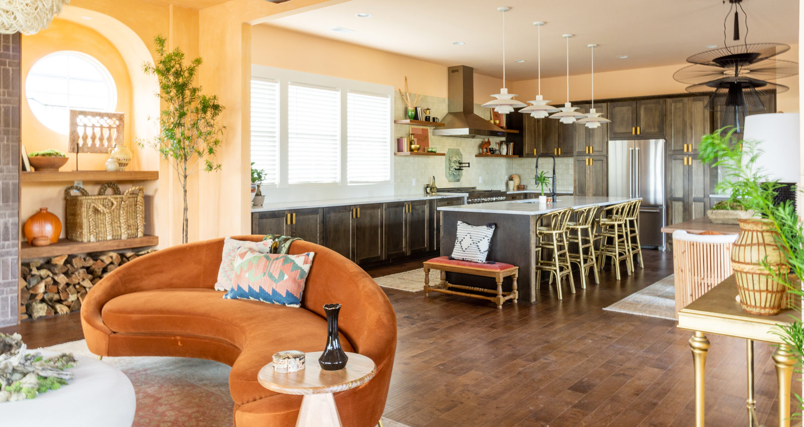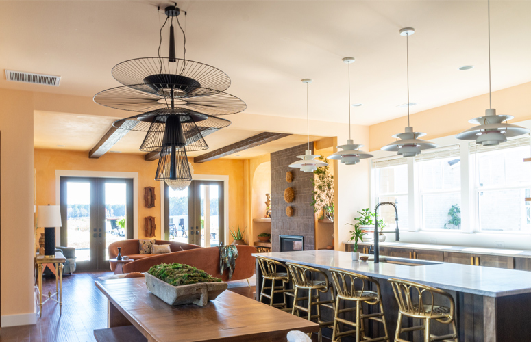 Accustomed to rehabbing homes in Detroit with much smaller budgets (via HGTV's Bargain Block), Keith and Evan embraced the challenge of bringing their colorful, cozy aesthetic to this massive 3,500 square foot space. With custom furnishings, fascinating architectural details and vibrant colors, the results are simply amazing. Inspired designer pendants from Louis Poulsen, Forestier and Arteriors Home perfectly define each space with style and grace.