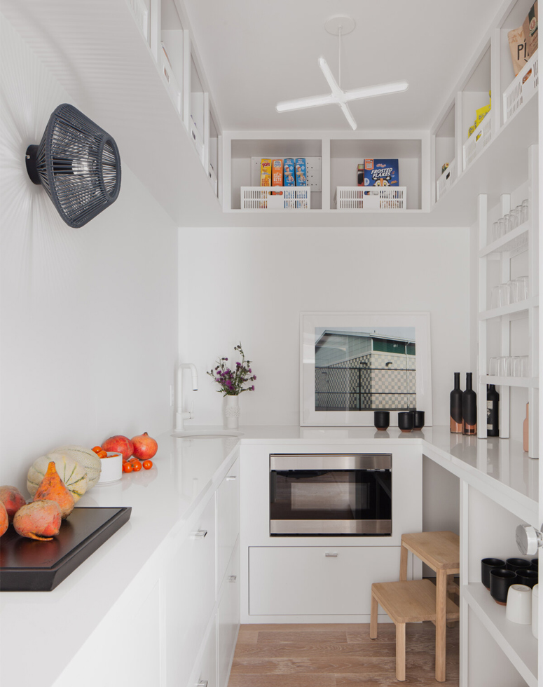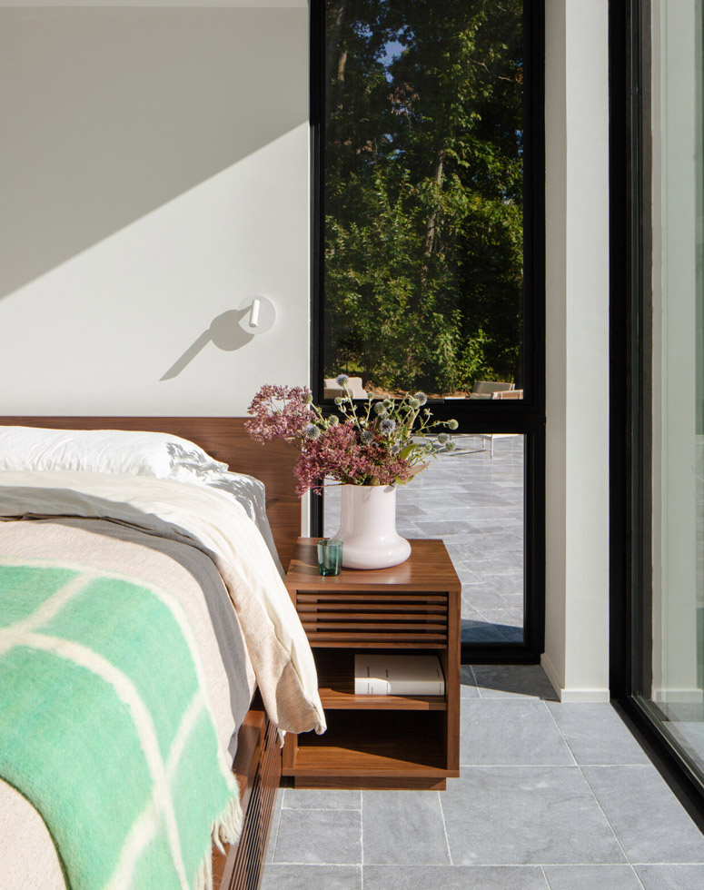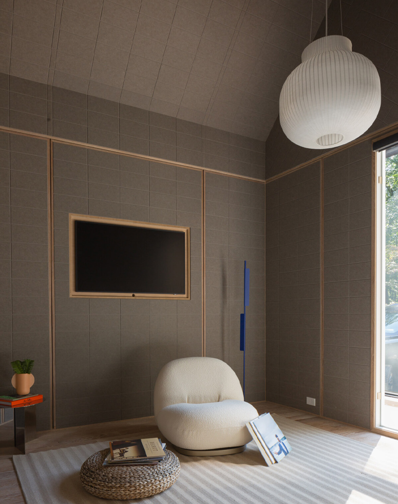 They also embraced the surrounding nature with a patio shape that mimics the shadow of the house on the ground, can lighting in the living room arranged to look like a constellation, and pendants that look like clouds floating in mid-air.
