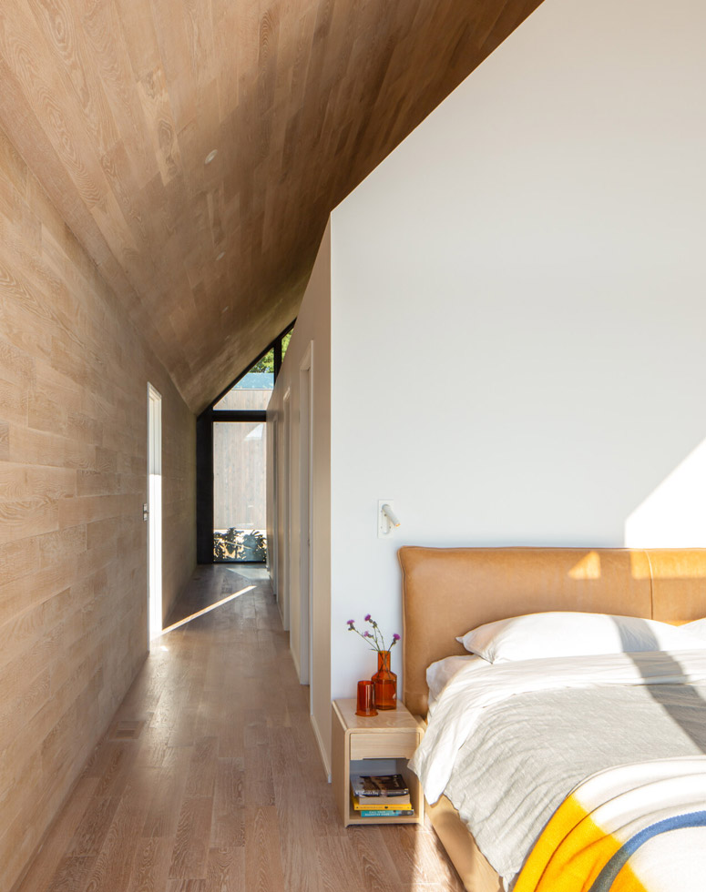 Hallways and interior rooms are essentially flipped in this architecture. The hallways run along the exterior walls, allowing light to enter and providing views from the roadside to lakeside. This also gives interior spaces an added layer of privacy.