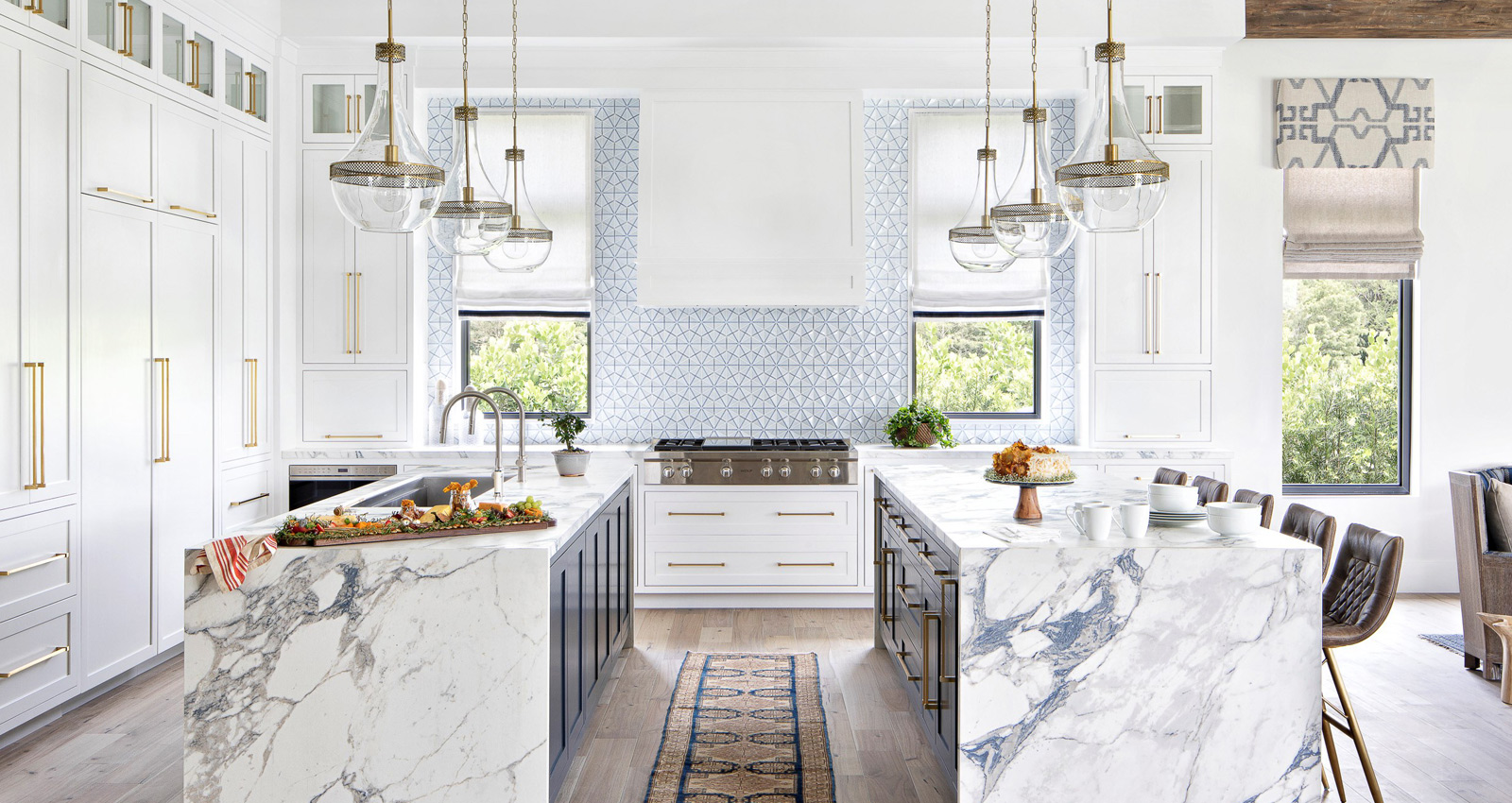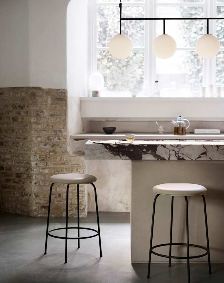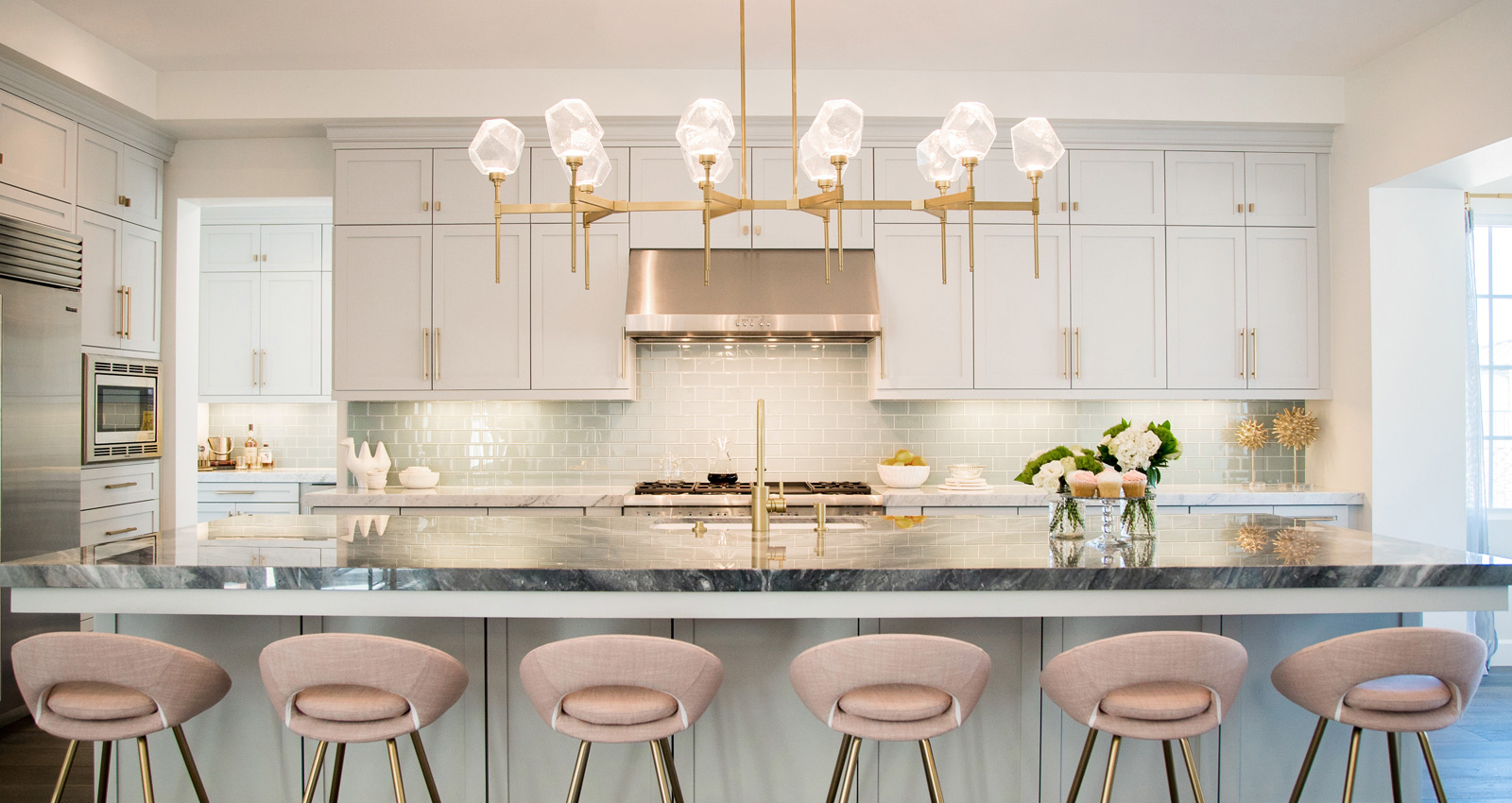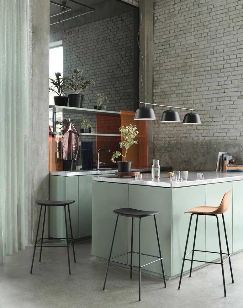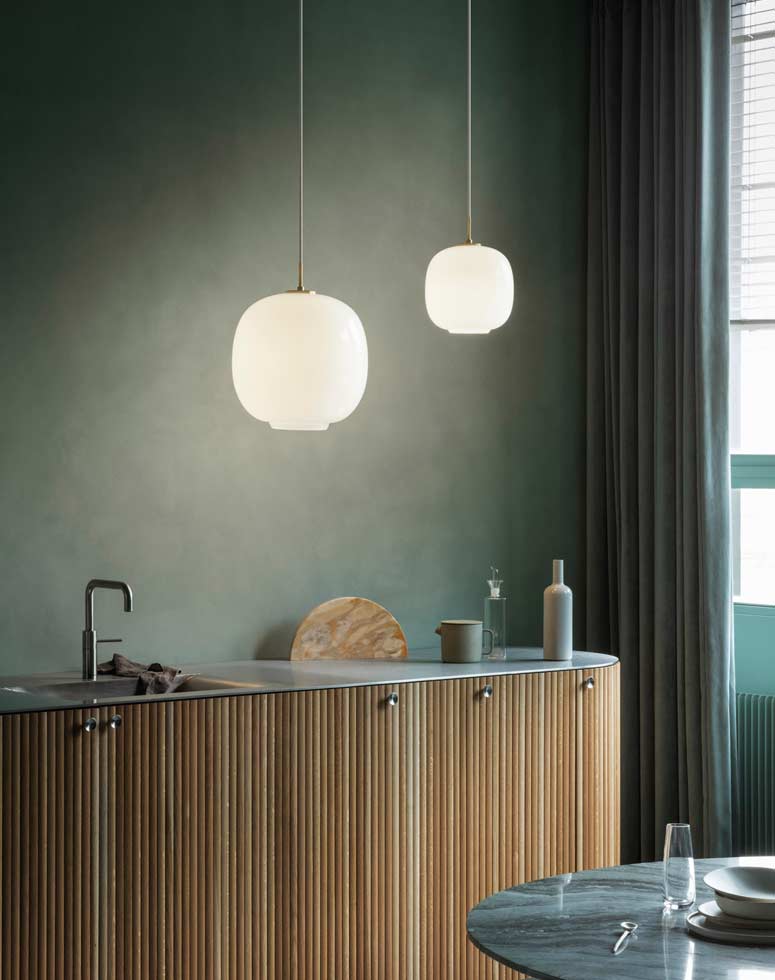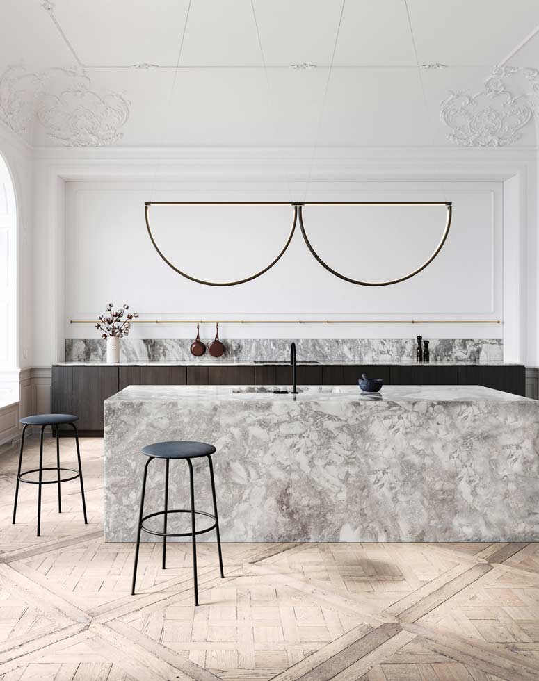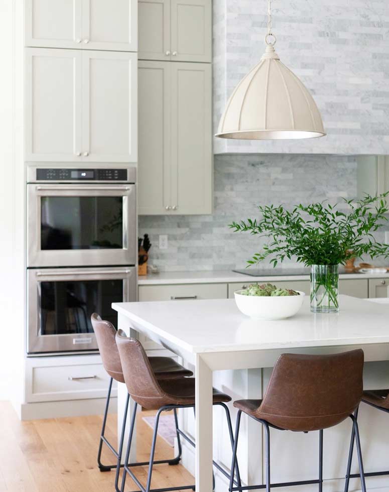 Whether you go with a linear suspension above the island or multiple kitchen island lights, always make sure you have at least six inches of breathing room between the fixture and the edge of your kitchen island. Spreading light evenly is key, and just like any good dessert, layering is a good thing. Bon appetit!