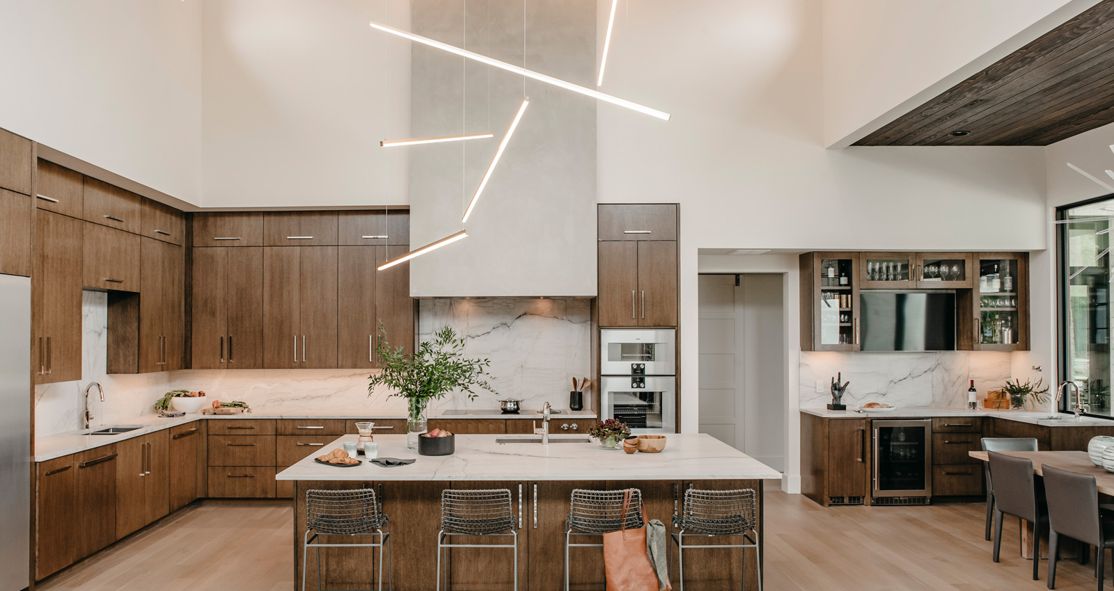 In terms of kitchen lighting, linear suspensions are a great option for above the kitchen island. You can find linear fixtures in just about every shape, size, color and style. If you're not looking to go the linear route, two or three pendants or an expansive chandelier are great options. No matter what you choose, make sure your island is thoroughly lit; no one likes cooking in the dark.