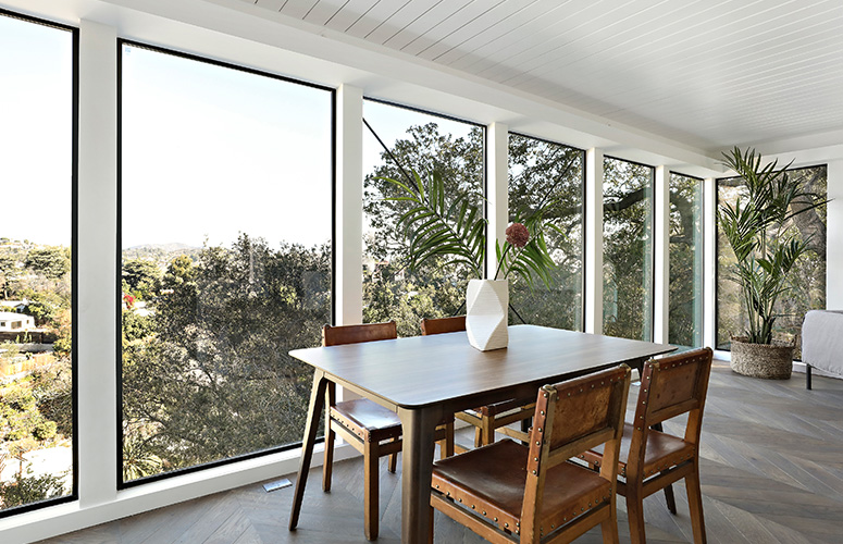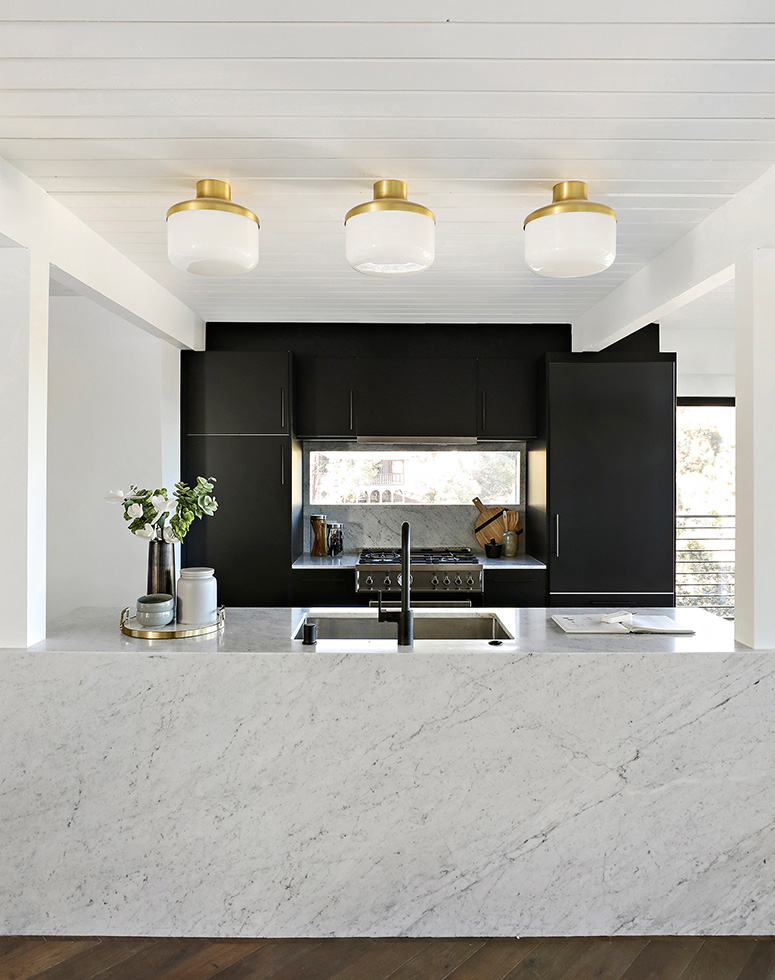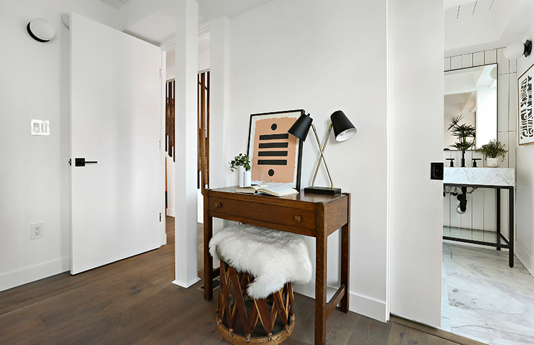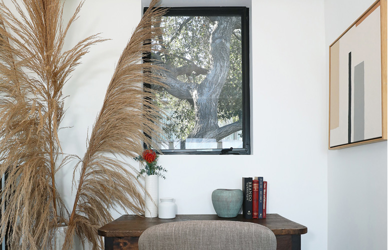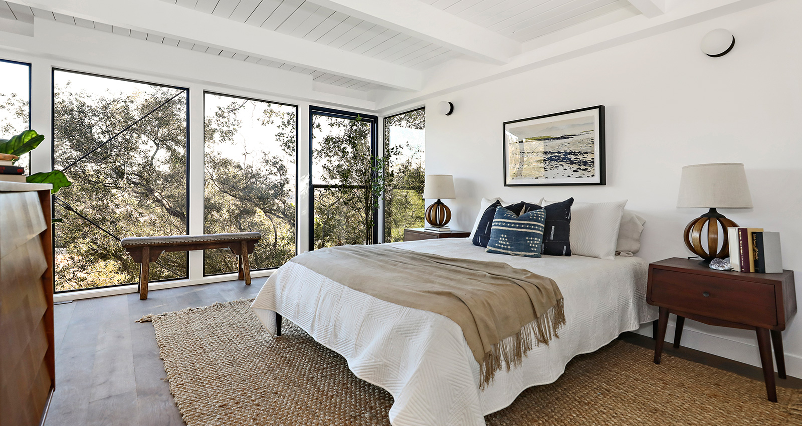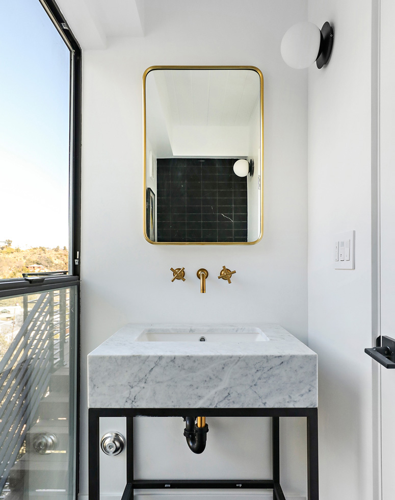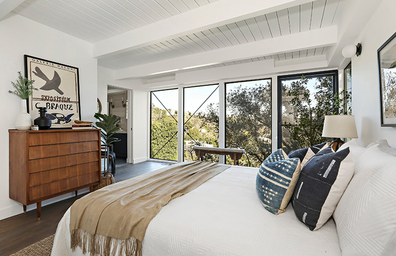 No space is too small for a window, highlighted in the guest bath and writing nook, drawing sunlight and nature in wherever possible. The same hues and textural elements from the living room and kitchen color the rest of the home: Marble, wood, brass and earth tones. With so much visual appeal from the surrounding landscape, the interior is best kept subtle and uncluttered.