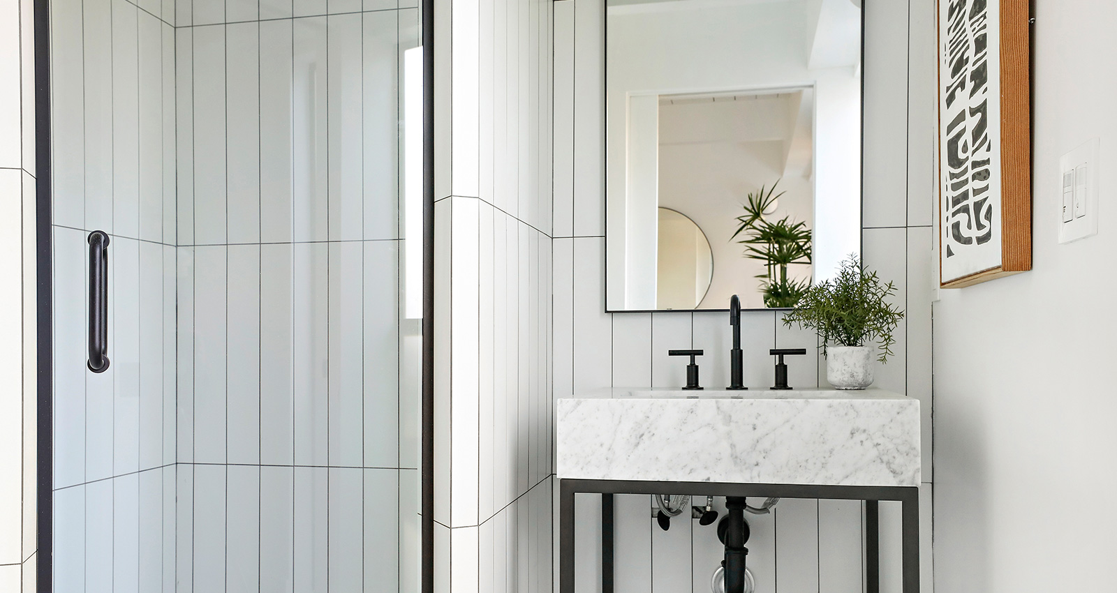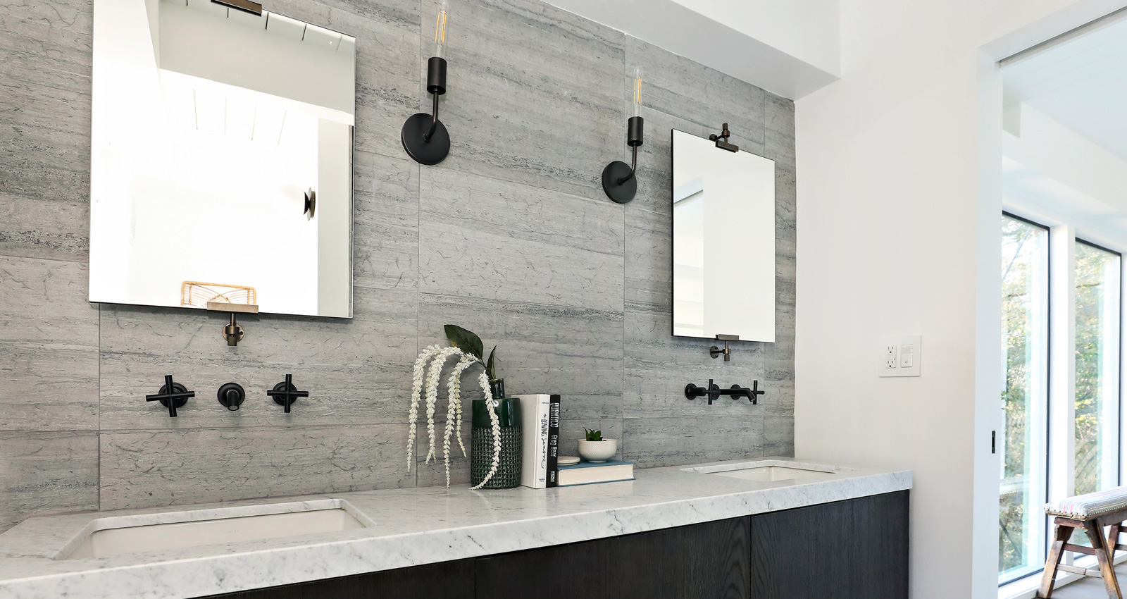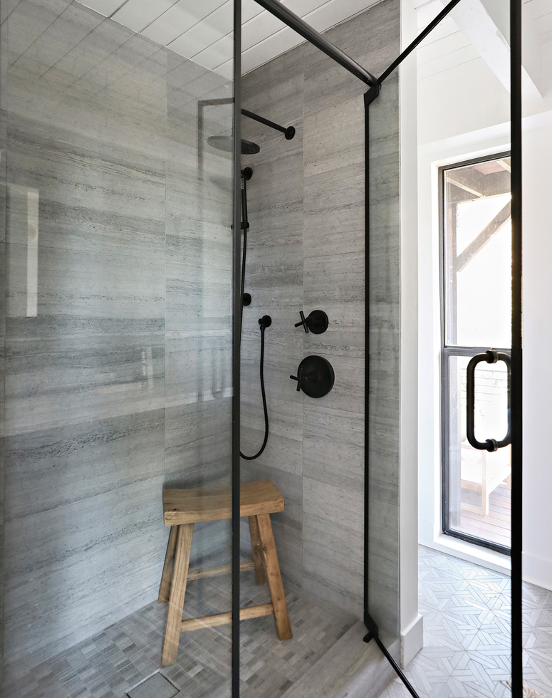The master suite is the pearl of the home, blurring the lines between rustic and Midcentury, bucolic and refined. Low-profile furniture ensures unhindered views in the bedroom, while grey stone striations and matte black finishes create a cool, tranquil atmosphere in the bathroom.