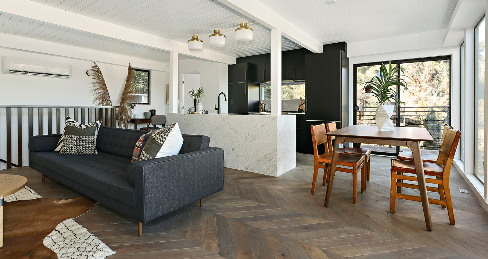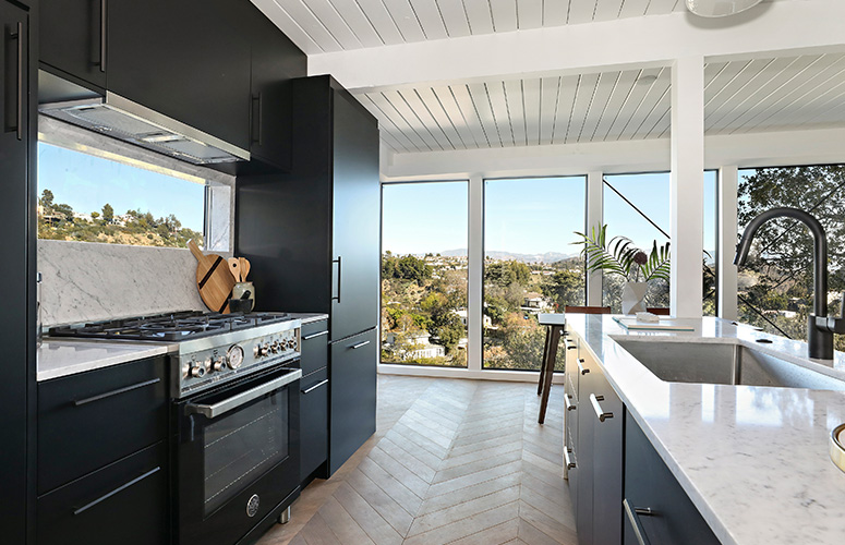 A melange of materials serve as a chic, textural foreground to the stunning hillside views. Marble counters add depth without stealing the show, while chevron parquet floors and wooden wainscoting on the ceiling guide your eye to the expansive windows - the true star of the home.