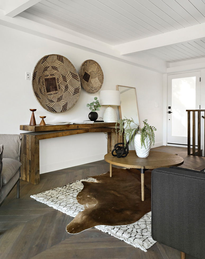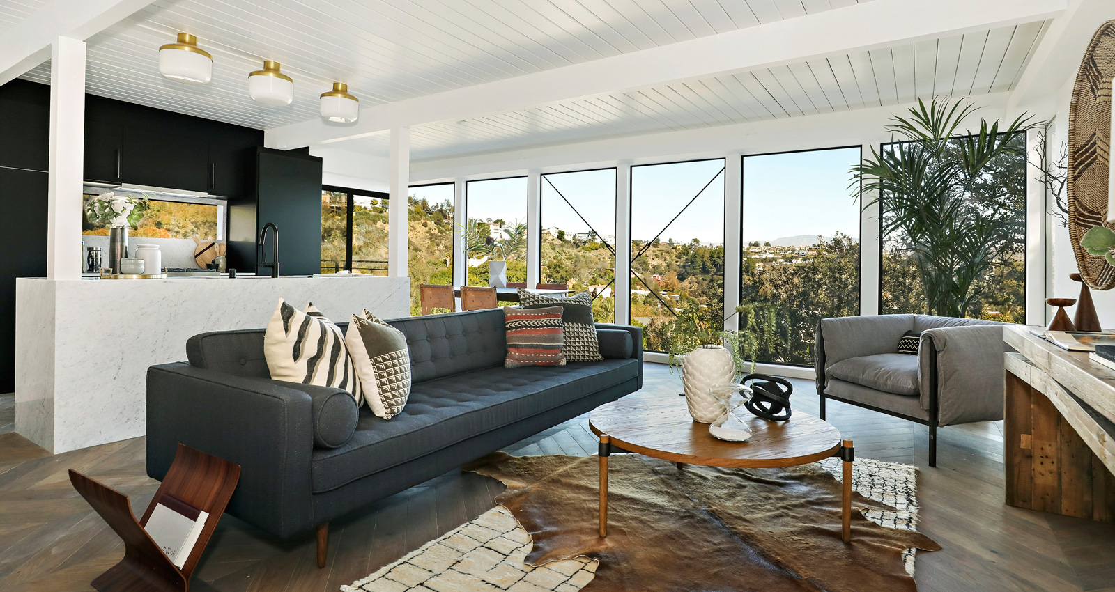 Throughout the living area, rustic and handmade pieces set a casual, bohemian vibe. Patterned, woven baskets, ceramic pottery, worn leather chairs and African prints add a human touch to the contemporary architecture, helping warm up the space. Midcentury modern hints, like the button-tufted sofa and aged brass ceiling lights serve as a nod to the LA hill's early days - in fact, the iconic Stahl house is only a few miles away.
