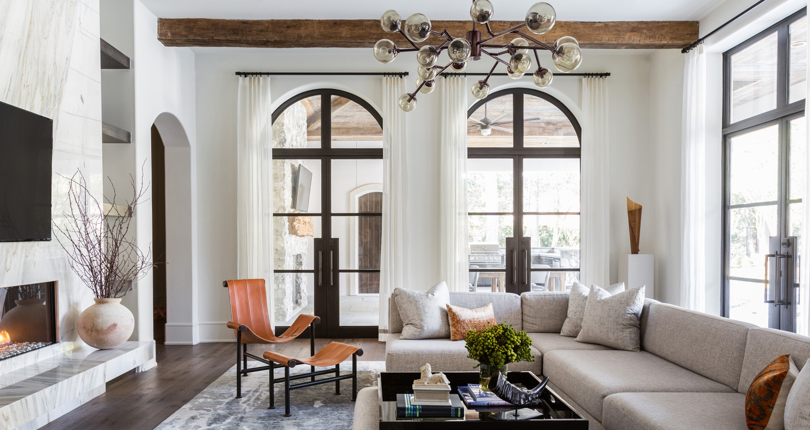 The large, open nature of a living room makes it the perfect space for a statement chandelier. If you have the room, don't be afraid to go big. Sputnik shapes branch out and offer ample lighting, while staggered, multi-light and multi-tier fixtures can tie together upper and lower levels with ease.