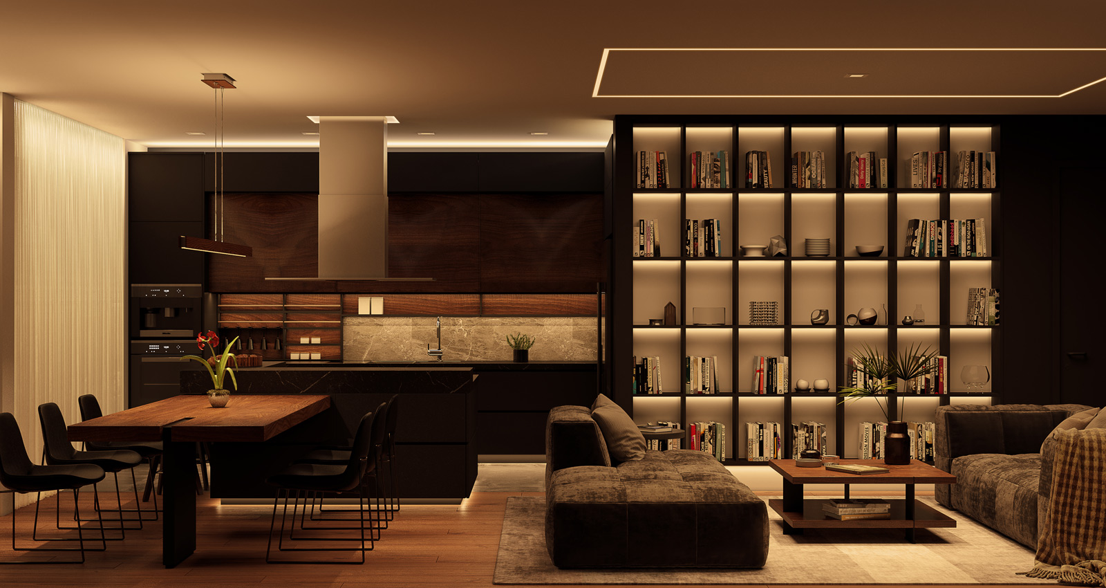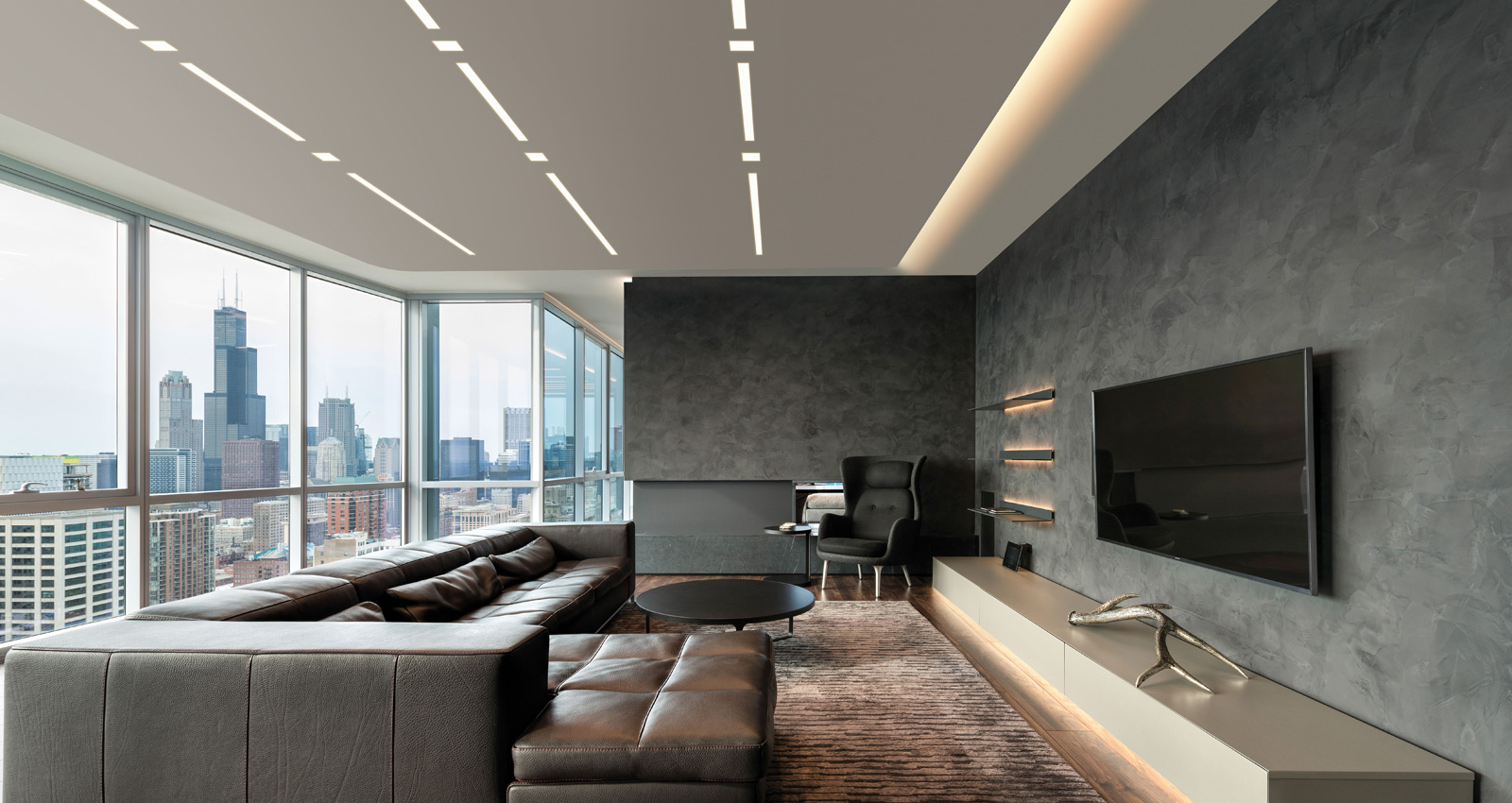 When planning your living room lighting, always consider the architecture of your space. Textured walls, alcoves, open shelving, each provide opportunities for architectural lighting - like wall washers and wall grazers - that not only elevate the look of your space, but the functionality as well.