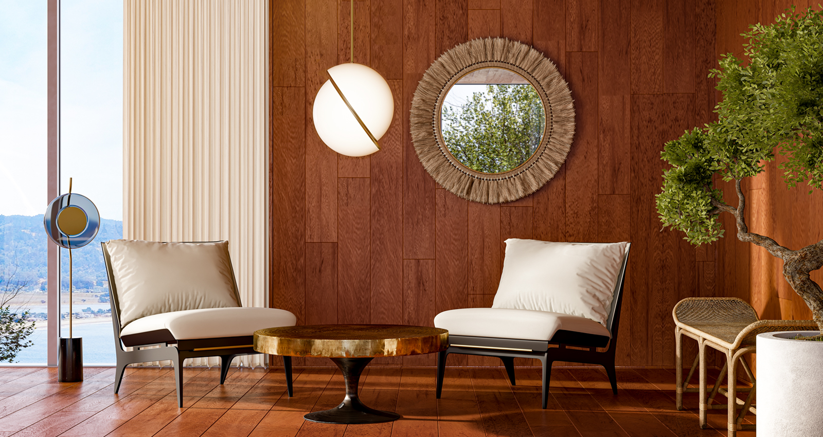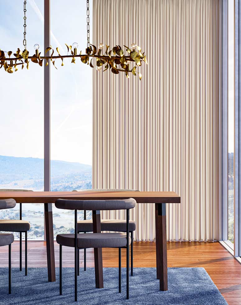 Panoramic windows offer arresting views of the surrounding bay, serving as inspiration for the interior fixtures and furniture. The Eucalyptus Leaf chandelier is a functional work of art, following the length of the Pier dining table. A highly polished Deep Blue Hebe table lamp mimics the reflective surrounding water, while the abaca fiber mirror echos the nearby foliage.