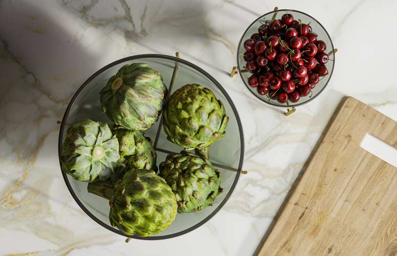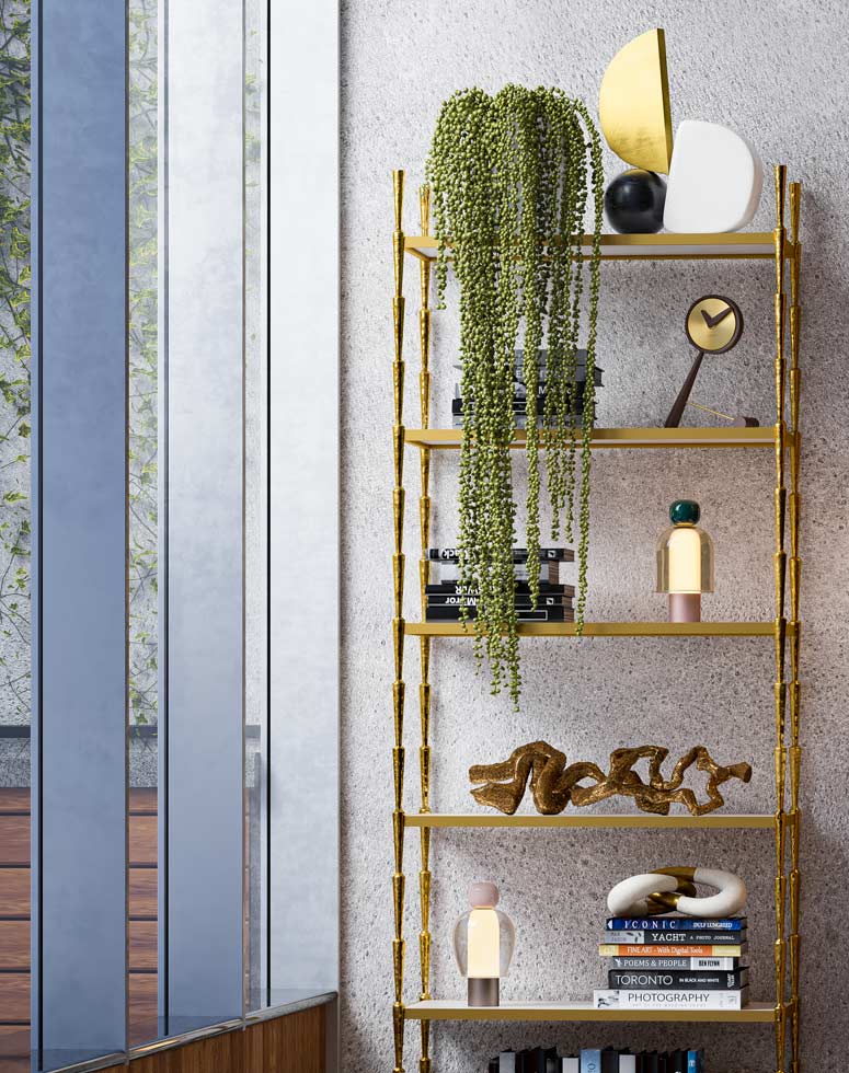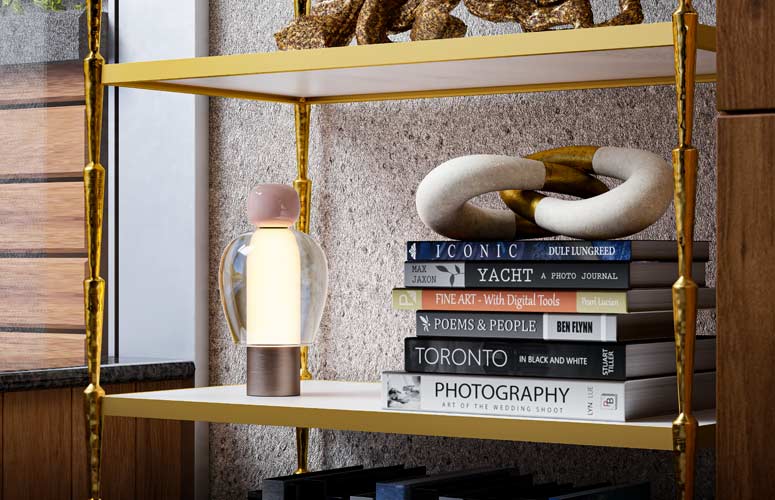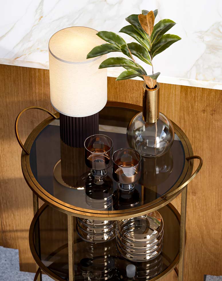 Elsewhere throughout the kitchen, small luxurious details elevate even the most mundane tasks. The round bar cart is a classic midcentury staple, displaying portables, vases and cocktail essentials. Smoked glass bowls, brass finishes and the stunning Luna Kaleido pendant from Gabriel Scott make everything from solo meals and crowded soirees extra glam.