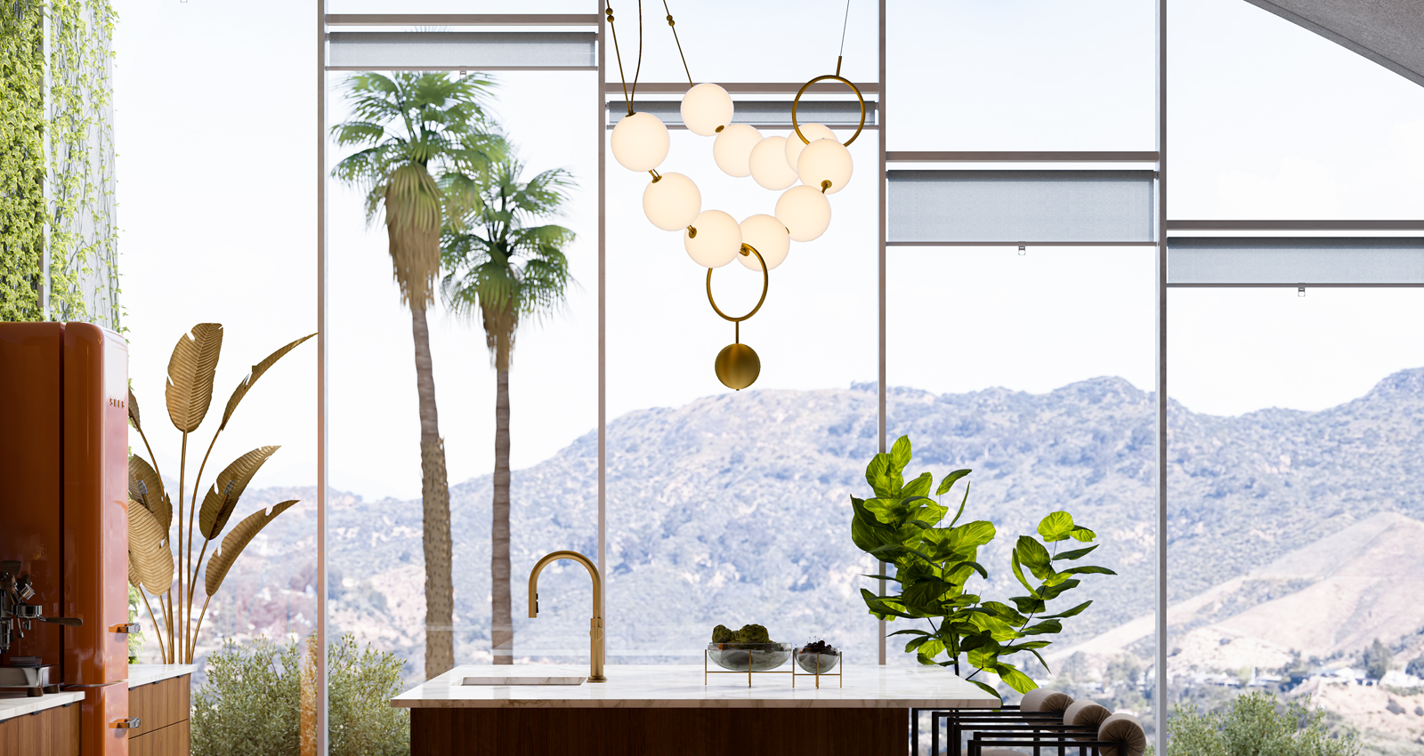 Grandiose windows, posh finishes, abundant foliage and chic statement lighting make this midcentury modern kitchen a glamorous star in the Hollywood Hills.