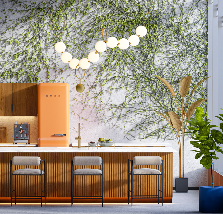 Midcentury modern style is all about vintage, Hollywood glamour, and this spacious kitchen checks all the boxes. An antique brass etagere displays portable lamps, plants, books and objets with character. The concrete walls serve as an earthy texture, against a sea of metal, glass, wood and stone. The real star of the show is the Coco chandelier above the kitchen island. Like a string of pearls, ten hand-blown glass globes drape together to form a beautiful piece of home jewelry that offers ample light when the sun sets.