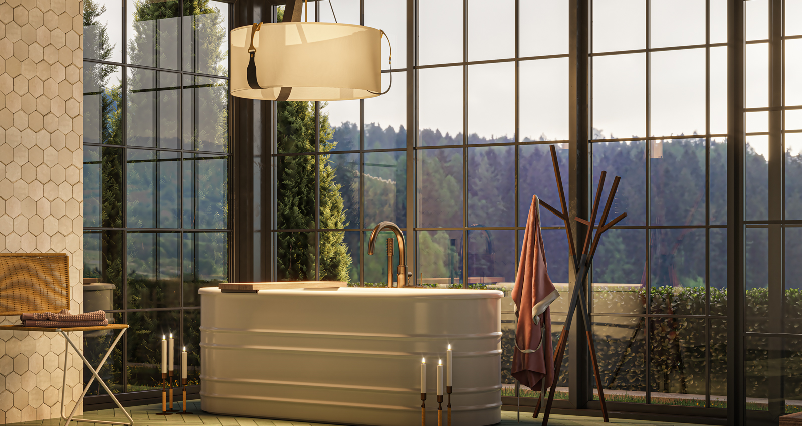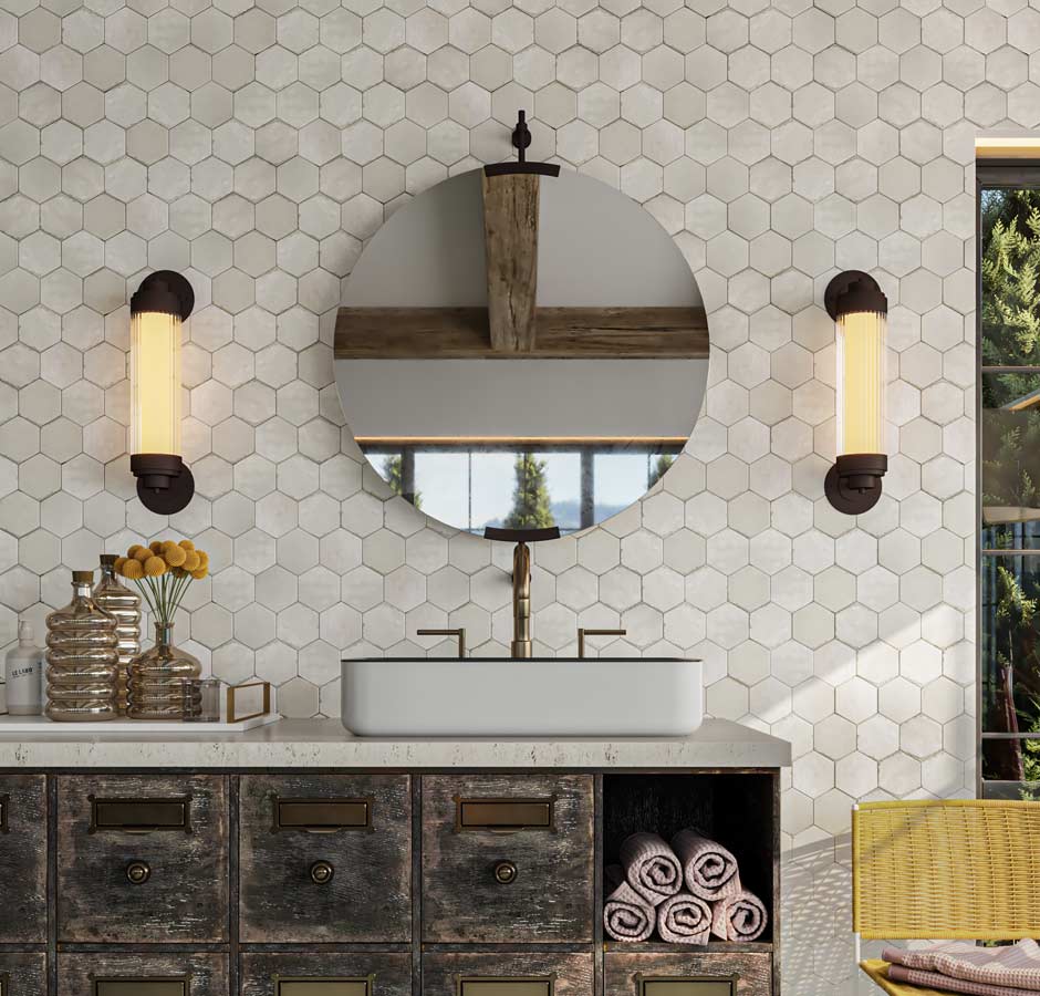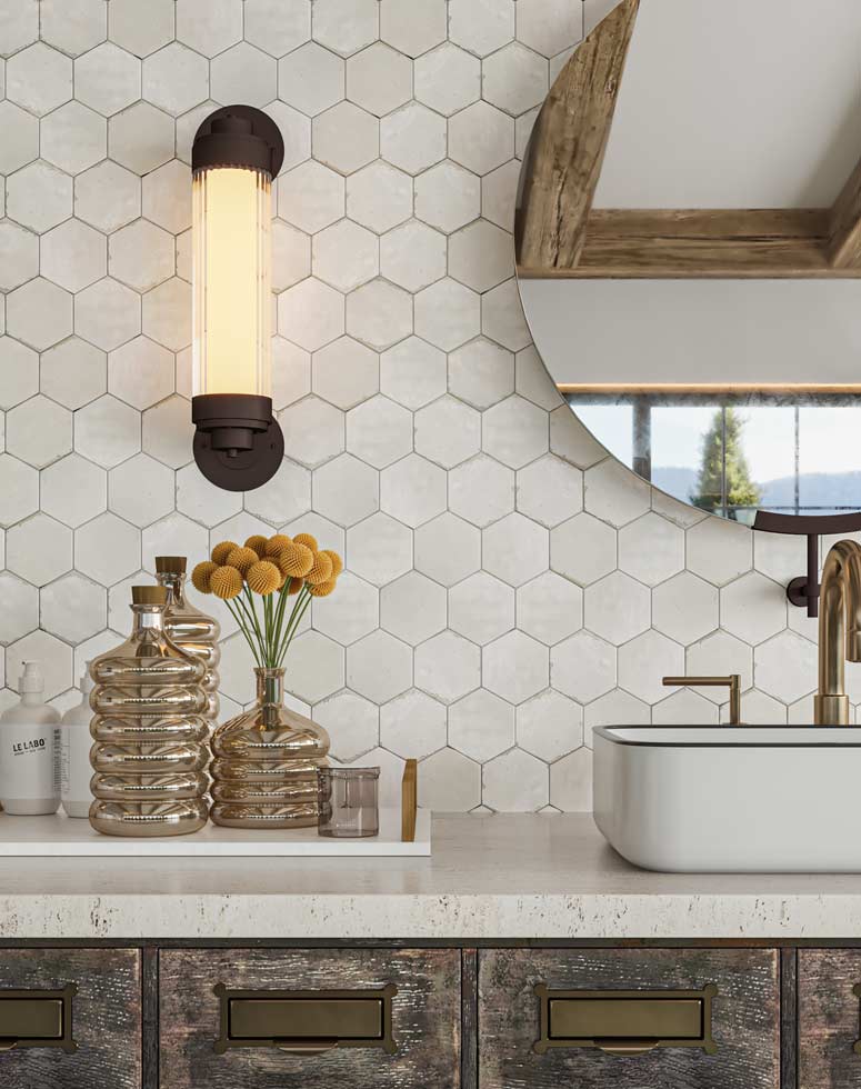 When the natural light fades, the leather-strapped Saratoga pendant and Art Deco Pillar vanity lights come to life. The Cestita portable lamp can be moved from place to place - perfect for tub reads or extra grooming light. And for something truly intimate, the rattan-wrapped Duca candle holders create the ultimate farmhouse spa experience.