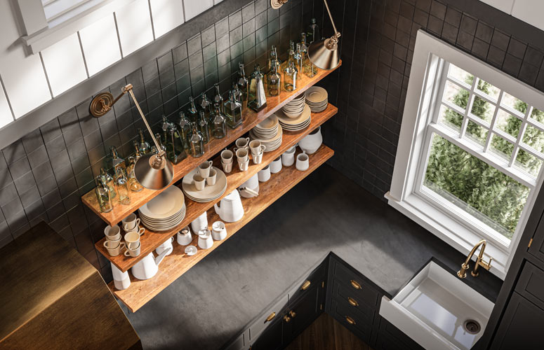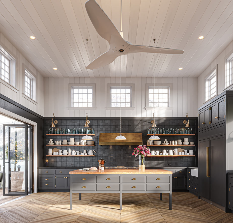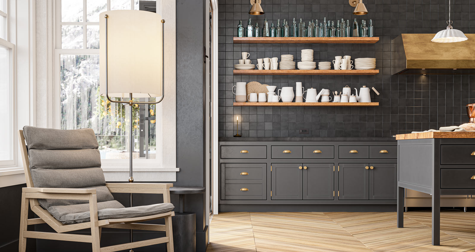 Sophisticated and dapper, with rustic textures and elements, this spacious kitchen is quintessential modern farmhouse. Metal swing-arm wall lights in aged brass highlight clean, open shelving. The pierced ceramic Anita pendants bring vintage charm, echoing the white hues found in the shiplap ceiling to help break up the sea of charcoal. Natural wood, warm metals and quiet comforts - like the sunlit reading nook - make this sizable kitchen feel a bit more cozy.