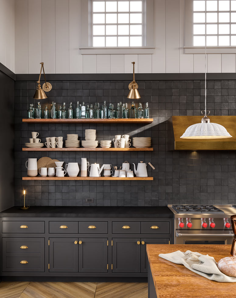 This modern farmhouse kitchen pairs chic charcoal hues and clean lines with vintage ceramic fixtures and antique brass finishes, creating a space that's at once flea market and fabulous.