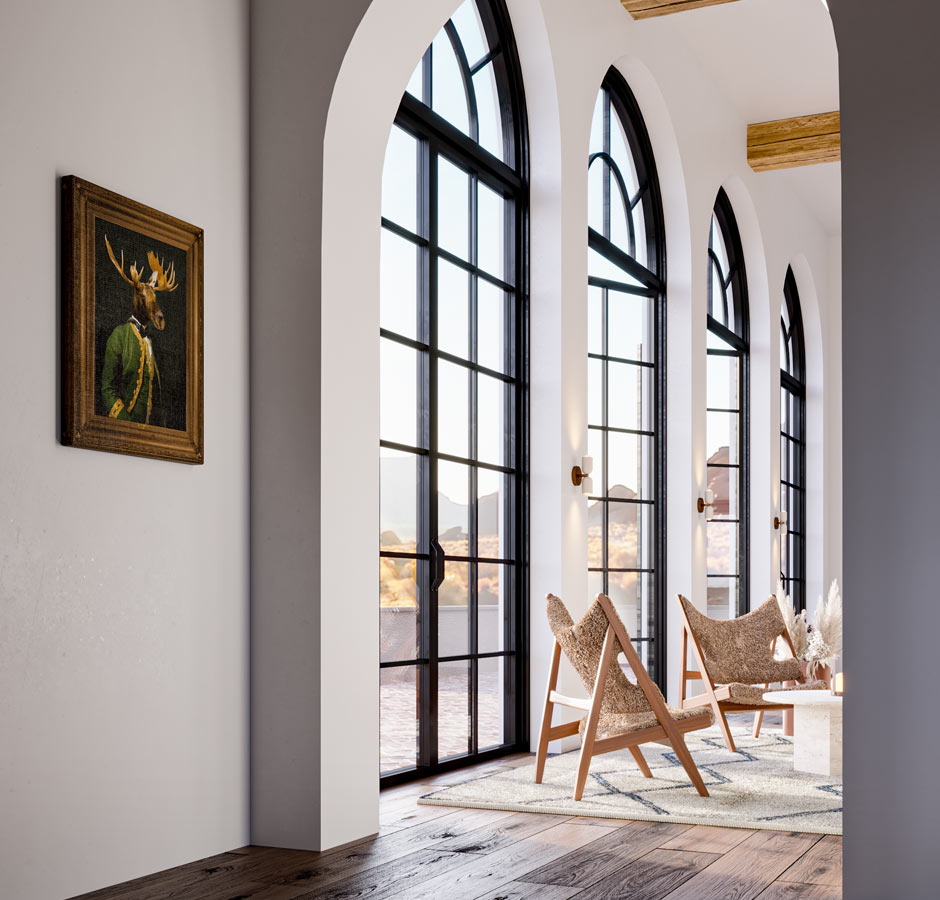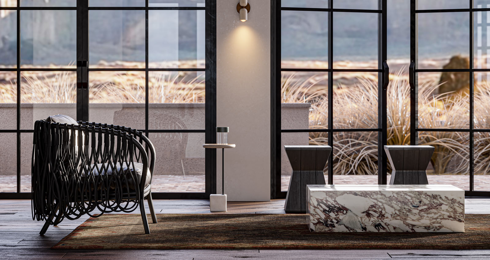 The key to working with an expansive living room is to create regions, each with their own flavor but united in color and material. A sitting area next to the fireplace encourages conversation and serves as HQ for larger friend and family gatherings, while the softer sheepskin chairs carve out a spot for more intimate conversations and reading marathons.