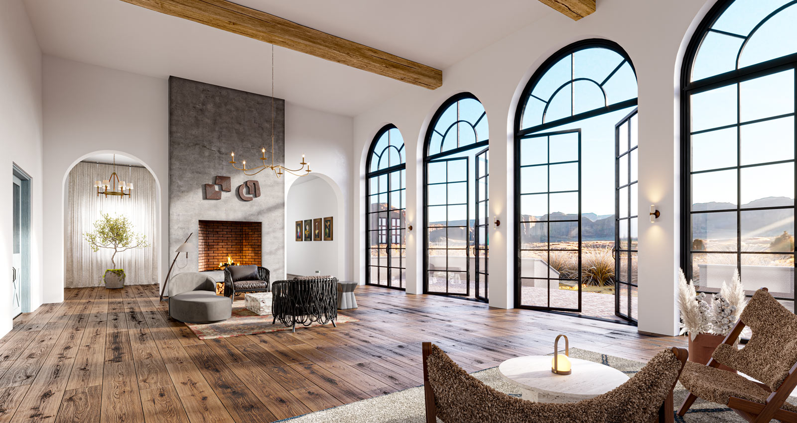 Many of today's modern farmhouses and cattle ranches lie in desert climate, making this southwestern living room the perfect place to highlight a wide variety of regional materials. Leather armchairs, ceramic sconces, beige rose marble and travertine mimic the surrounding geography and invite the natural landscape inside.