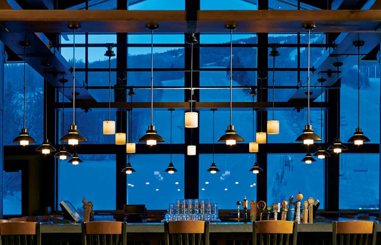Touches of iron, stone and glass bring glimmer and texture indoors, breaking up the monotony of wood-on-wood. Shimmering glass chandeliers serve as pieces of art both on and off, while a full rock wall draws directly from the surrounding landscape and creates a one-of-a-kind focal point.