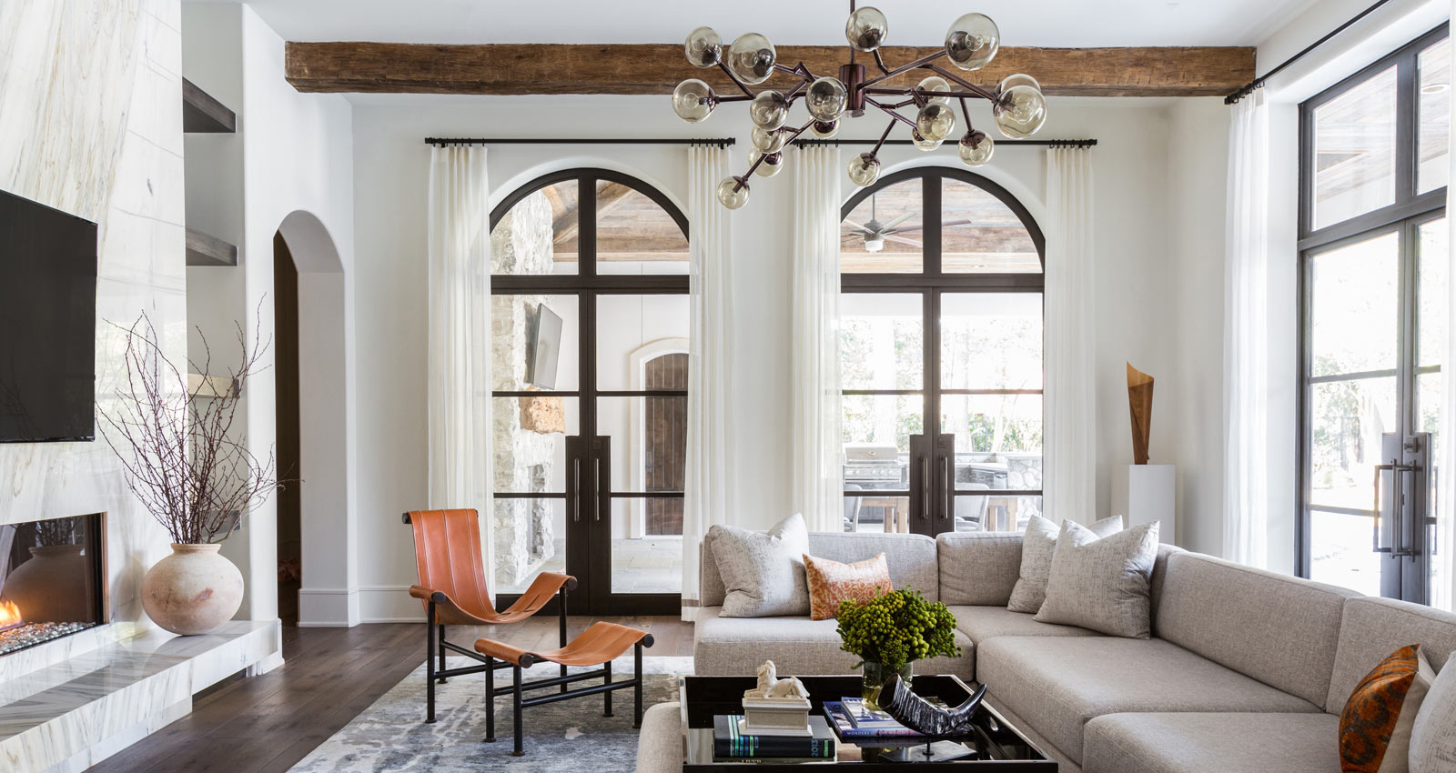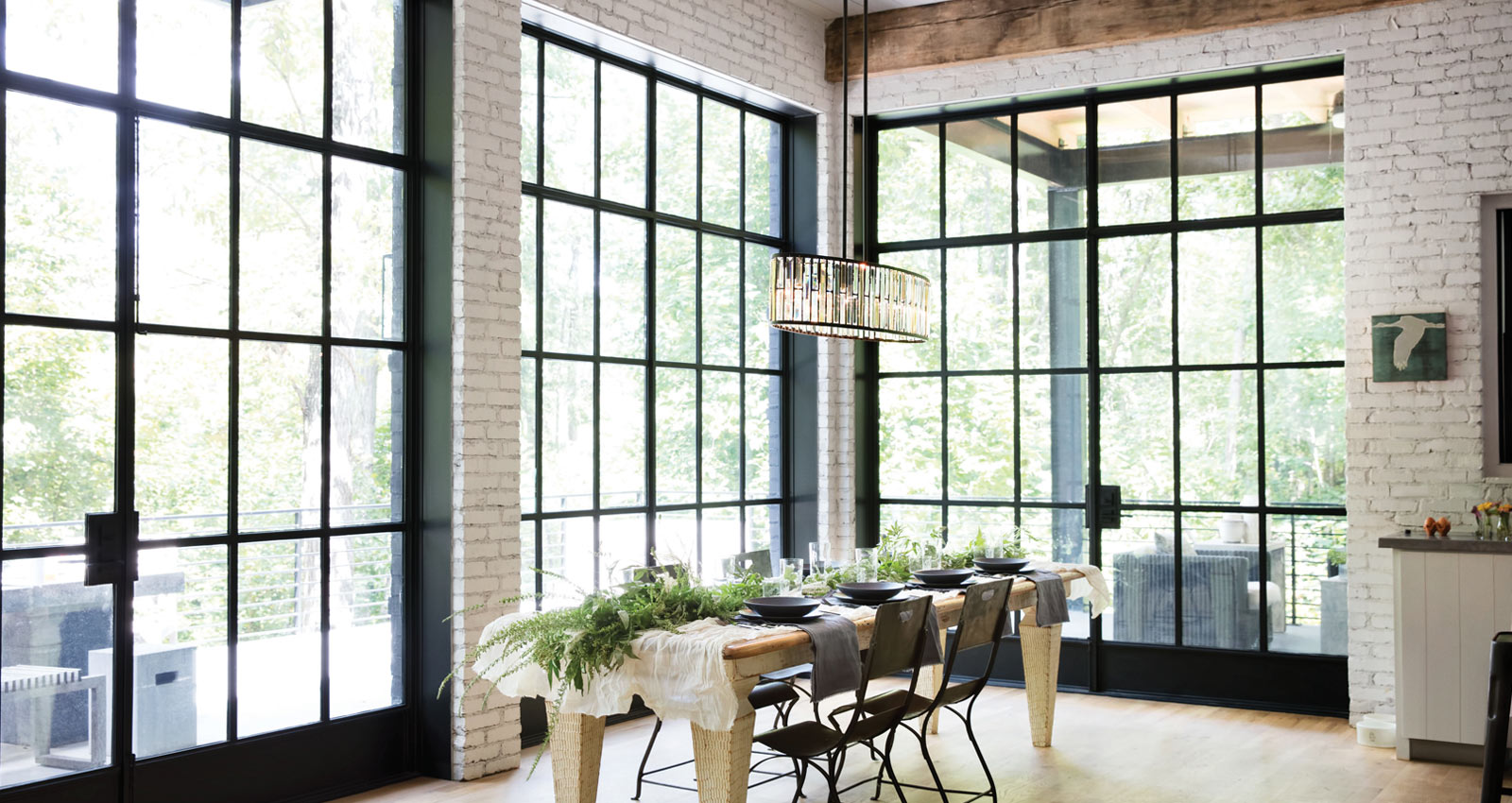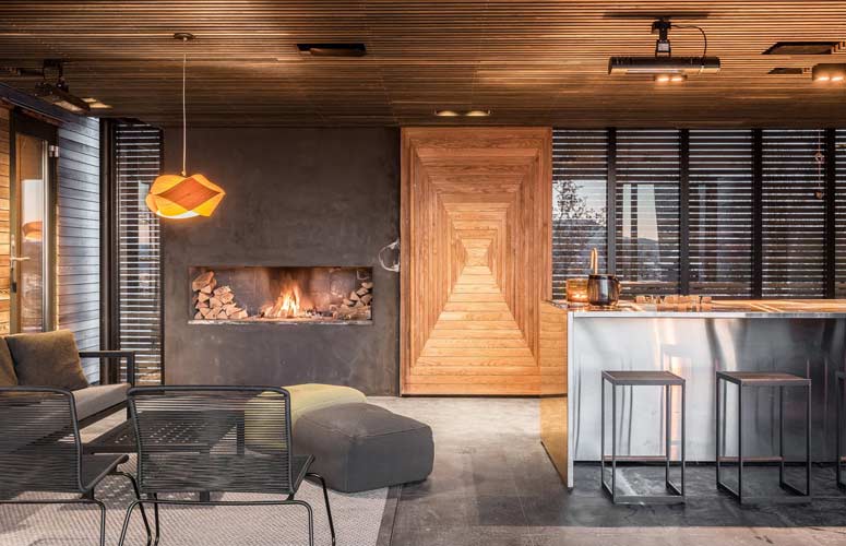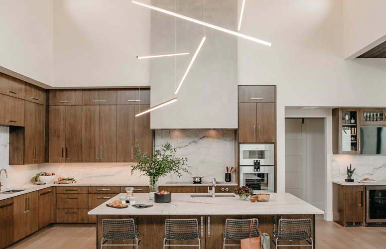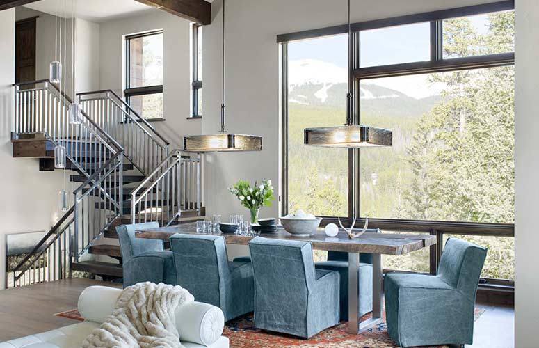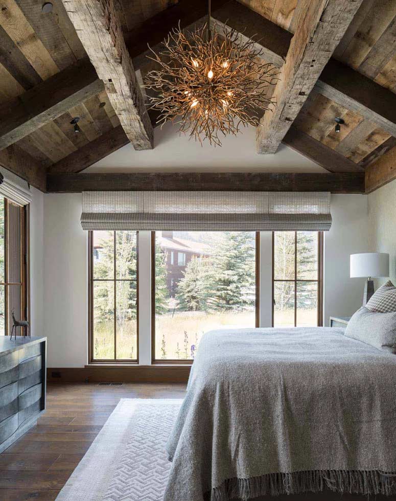 Warmth is a key factor in any modern lodge, and nothing warms a space quite like wood. Exposed, reclaimed beams, wooden cabinetry, hardwood floors, all play an integral role in creating an environment that feels snug and lived-in. When it comes to lighting, technology like Warm Dim and Tunable White allow you to dial into the perfect color temperature (aim for 2200K to 2700K) to create a warm, inviting mood.