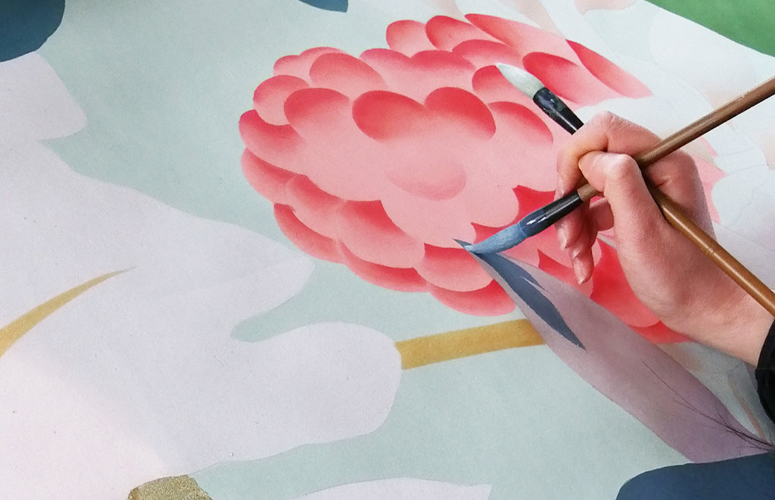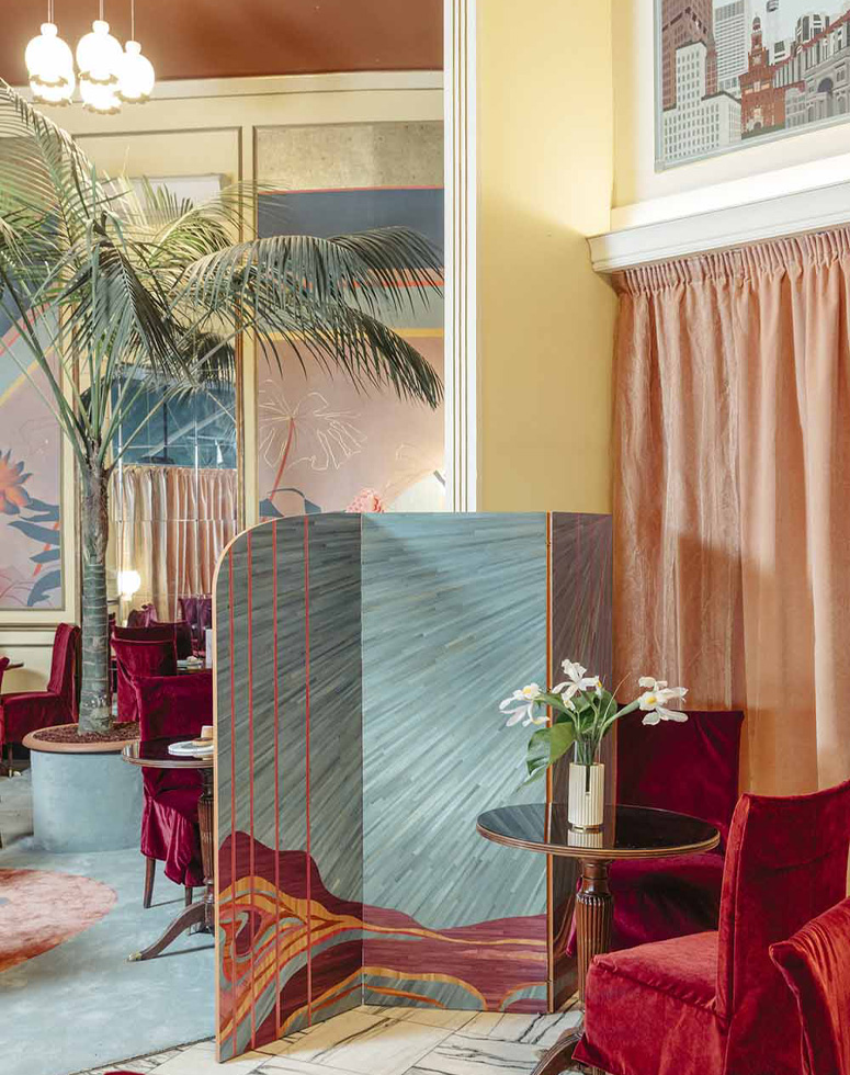 The result: Precious silk wallcoverings transport Celestino's vision of a surreal landscape, including illustrations of geometric figures and botanical elements such as oversized raspberries and a tropical palm tree. These wallcoverings are divided into three large panels, which provide the backdrop for the dreamy Tea Room.