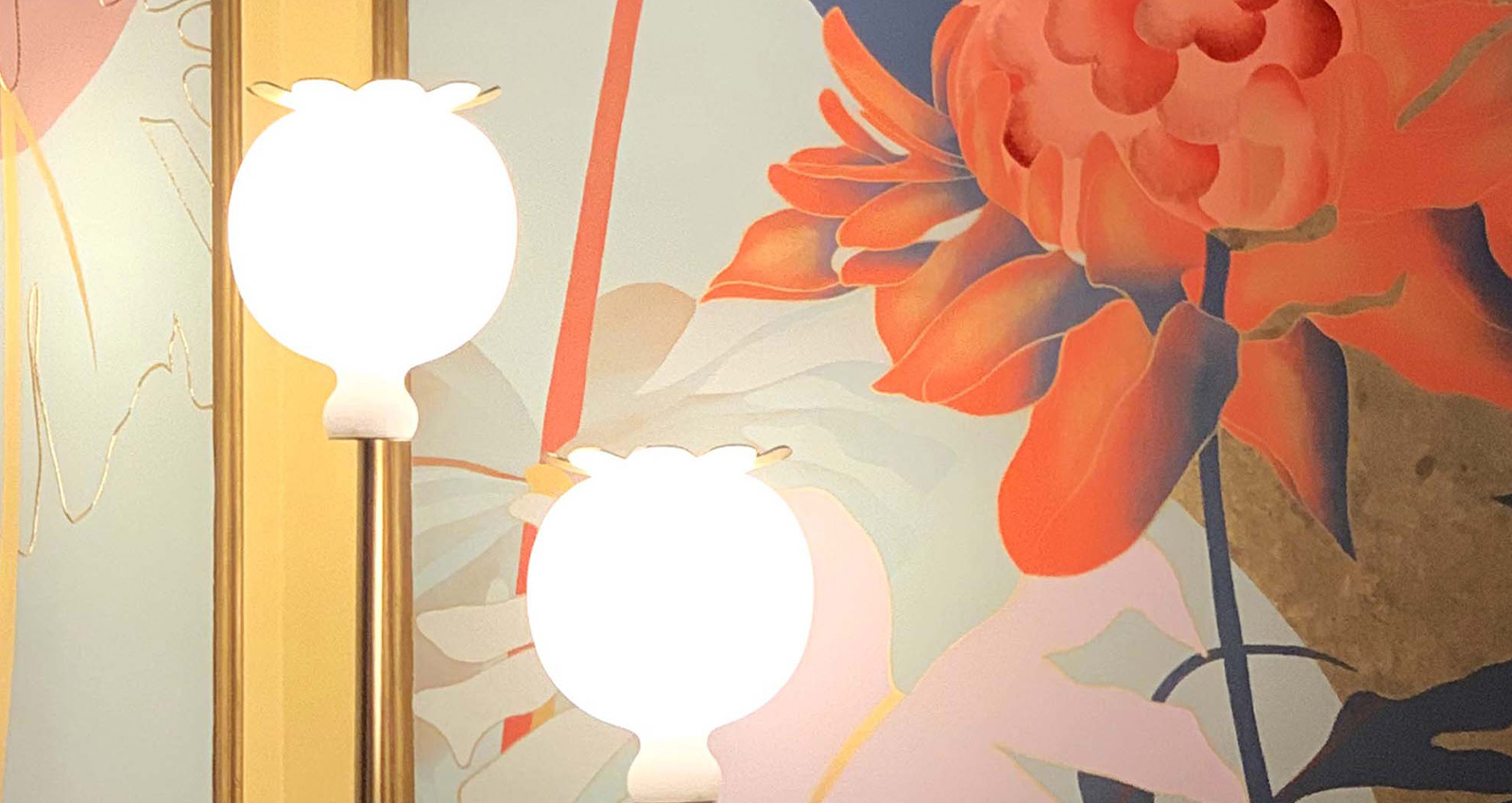 Opyo Pendants and the Opyo Floor Lamp by kdln playfully accentuate the organic theme of the space. Understated and elegant, the hand-blown opal white glass diffuser finishes with whimsical metal petals.